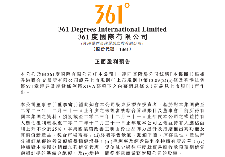 2月5日,361度發(fā)布公告,預(yù)期截至2023年12月31日止年度公司的權(quán)益持有人應(yīng)占溢利較截至2022年12月31日止年度公司的權(quán)益持有人應(yīng)占溢利上升不少于25%。 據(jù)悉,該集團(tuán)業(yè)績(jī)改善主要得益于品牌力提升及持續(xù)推出高功能及高價(jià)值新產(chǎn)品,以契合市場(chǎng)需要;終端零售景氣,動(dòng)銷(xiāo)平衡,庫(kù)存良性,產(chǎn)生部分補(bǔ)訂單促進(jìn)營(yíng)業(yè)額取得穩(wěn)健增長(zhǎng);毛利率及經(jīng)營(yíng)溢利率持續(xù)有所改善;持續(xù)對(duì)集團(tuán)分銷(xiāo)商加強(qiáng)信貸管理,促使減少過(guò)往年度就貿(mào)易應(yīng)收款項(xiàng)預(yù)期信貸虧損計(jì)提的準(zhǔn)備金總額;以及增持一間從事電商業(yè)務(wù)附屬公司的股權(quán)。 |