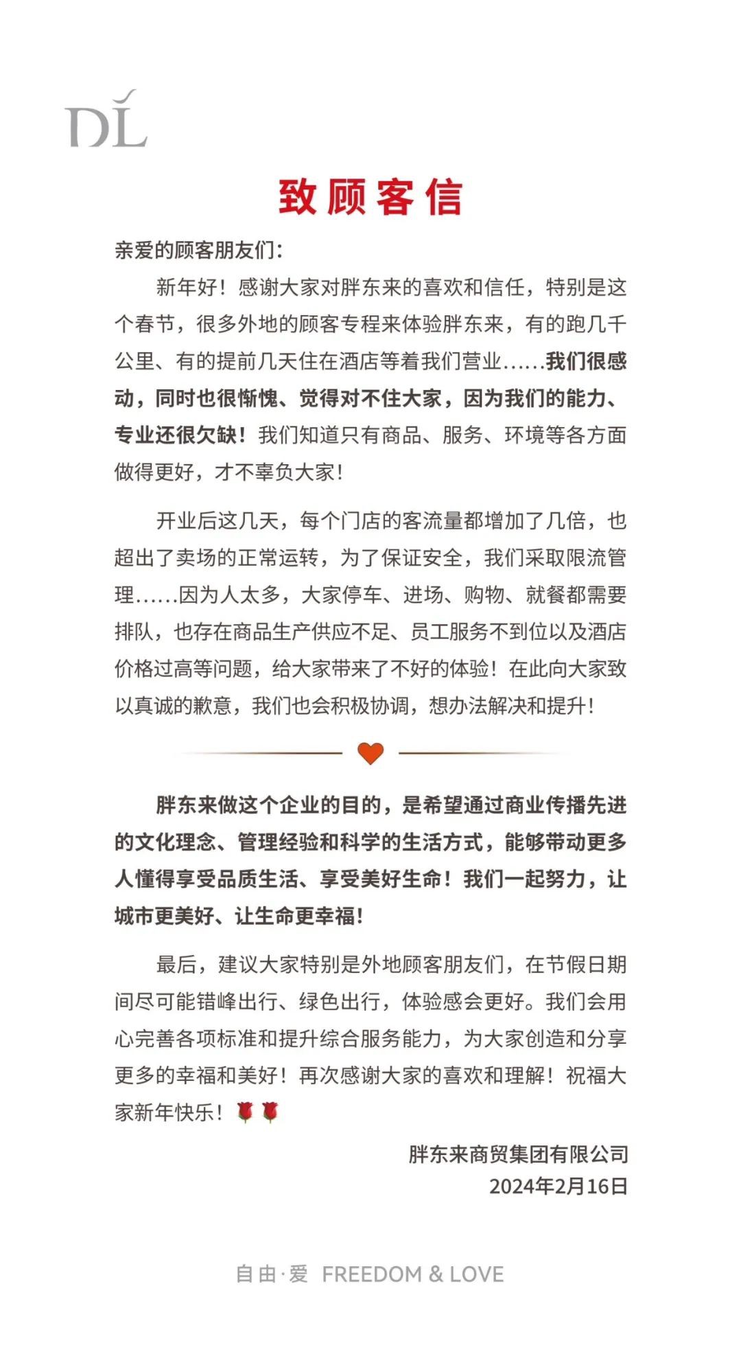 2月16日,胖東來發(fā)布《致顧客信》,就近期限流管理致歉。 胖東來稱,新年好!感謝大家對胖東來的喜歡和信任,特別是這個春節(jié),很多外地的顧客專程來體驗胖東來,有的跑幾千公里、有的提前幾天住在酒店等著我們營業(yè)...... 我們很感動,同時也很慚愧、覺得對不住大家,因為我們的能力專業(yè)還很欠缺!我們知道只有商品、服務、環(huán)境等各方面做得更好,才不辜負大家! 開業(yè)后這幾天,每個門店的客流量都增加了幾倍,也超出了賣場的正常運轉,為了保證安全,我們采取限流管理...... 因為人太多,大家停車、進場、購物、就餐都需要排隊,也存在商品生產(chǎn)供應不足、員工服務不到位以及酒店價格過高等問題,給大家?guī)砹瞬缓玫捏w驗!在此向大家致以真誠的歉意,我們也會積極協(xié)調,想辦法解決和提升。 |
