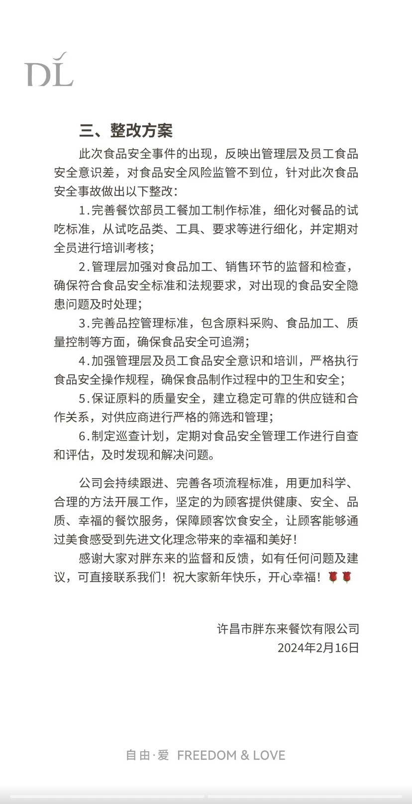 2月15日,有網(wǎng)友爆料稱河南許昌胖東來美食城員工悄悄蹲下嘗面后,未清洗筷子在鍋里攪拌。 2月16日19時30分許,胖東來發(fā)布關(guān)于“美食城員工制作員工餐未按標準試吃”的情況說明。聲明稱:該視頻中試吃員工當(dāng)時在火鍋環(huán)島操作臺內(nèi)制作當(dāng)天員工餐炸醬面,經(jīng)查看監(jiān)控及與當(dāng)事員工進行核實,員工在制作時,從煮面桶中撈出面條入口嘗過后,未更換筷子便繼續(xù)使用在鍋中攪面,未按照試吃標準進行試吃,此行為屬于嚴重食品加工安全事故。 關(guān)于“美食城員工制作員工餐 未按標準試吃”的情況說明 2024年2月15日,顧客通過抖音發(fā)布“時代廣場美食城小火鍋員工在營業(yè)期間試吃面條”的視頻內(nèi)容,經(jīng)調(diào)查落實,現(xiàn)將具體情況公示如下: 一、情況調(diào)查 經(jīng)落實,該視頻中試吃員工當(dāng)時在火鍋環(huán)島操作臺內(nèi)制作當(dāng)天員工餐炸醬面,經(jīng)查看監(jiān)控及與當(dāng)事員工進行核實,員工在制作時,從煮面桶中撈出面條入口嘗過后,未更換筷子便繼續(xù)使用在鍋中攪面,未按照試吃標準進行試吃,此行為屬于嚴重食品加工安全事故! 二、處理結(jié)果 1.顧客處理結(jié)果: 真誠感謝顧客幫助我們發(fā)現(xiàn)問題,為顧客發(fā)放建議獎并郵寄禮品一份! 2.部門處理結(jié)果: (1)員工處理結(jié)果:通過對事件的調(diào)查還原,員工在制作員工餐時未使用一次性餐具將面條盛出進行試吃,未嚴格按照標準執(zhí)行,造成食品加工安全事故,依據(jù)胖東來《各項管理制度》—餐飲商品管理制度第3條:未按照食品安全要求使用操作工具,存在嚴重食品安全隱患,對當(dāng)事員工解除勞動合同! (2)主管處理結(jié)果:部門主管在日常管理中對員工標準執(zhí)行情況監(jiān)管不到位,造成此次食品加工安全事故,依據(jù)胖東來《各項管理制度》對相關(guān)主管降一級三個月! 因我們管理能力和專業(yè)能力不足,目前對火鍋檔口進行關(guān)停,不做火鍋品類! 三、整改方案 此次食品安全事件的出現(xiàn),反映出管理層及員工食品安全意識差,對食品安全風(fēng)險監(jiān)管不到位,針對此次食品安全事故做出以下整改: 1.完善餐飲部員工餐加工制作標準,細化對餐品的試吃標準,從試吃品類、工具、要求等進行細化,并定期對全員進行培訓(xùn)考核; 2.管理層加強對食品加工、銷售環(huán)節(jié)的監(jiān)督和檢查,確保符合食品安全標準和法規(guī)要求,對出現(xiàn)的食品安全隱患問題及時處理; 3.完善品控管理標準,包含原料采購、食品加工、質(zhì)量控制等方面,確保食品安全可追溯; 4.加強管理層及員工食品安全意識和培訓(xùn),嚴格執(zhí)行食品安全操作規(guī)程,確保食品制作過程中的衛(wèi)生和安全; 5.保證原料的質(zhì)量安全,建立穩(wěn)定可靠的供應(yīng)鏈和合作關(guān)系,對供應(yīng)商進行嚴格的篩選和管理; 6.制定巡查計劃,定期對食品安全管理工作進行自查和評估,及時發(fā)現(xiàn)和解決問題。 公司會持續(xù)跟進、完善各項流程標準,用更加科學(xué)合理的方法開展工作,堅定的為顧客提供健康、安全、品質(zhì)、幸福的餐飲服務(wù),保障顧客飲食安全,讓顧客能夠通過美食感受到先進文化理念帶來的幸福和美好! 感謝大家對胖東來的監(jiān)督和反饋,如有任何問題及建議,可直接聯(lián)系我們!祝大家新年快樂,開心幸福! 許昌市胖東來餐飲有限公司 2024年2月16日 據(jù)此前報道,2月15日,網(wǎng)曝河南許昌胖東來美食城員工悄摸蹲下嘗面后,未清洗筷子在鍋里攪拌,引發(fā)關(guān)注。 |
