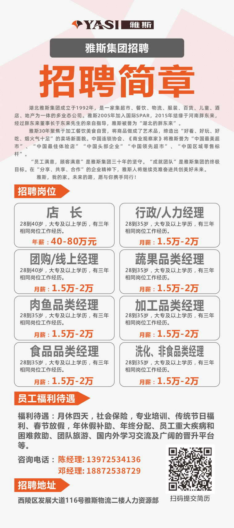 2月19日,職業(yè)零售網(wǎng)獲悉,被譽(yù)為“湖北的胖東來”的雅斯集團(tuán)發(fā)布了一則春季人才招聘的信息。 招聘涉及多個崗位,包括店長、行政/人力經(jīng)理、團(tuán)購/線上經(jīng)理、蔬果品類經(jīng)理、加工品類經(jīng)理等多個職位。其中店長的年薪20-80萬元,其他經(jīng)理綜合工資1.5萬至2萬元。 在員工福利方面,月休四天,社會保險,專業(yè)培訓(xùn)、傳統(tǒng)節(jié)日福利、春節(jié)放假,年休補(bǔ)助、年終分配、員工重大疾病和困難救助、團(tuán)隊旅游等。 湖北雅斯集團(tuán)成立于1992年,是一家集超市、餐飲、物流、服裝、百貨、兒童、酒店、地產(chǎn)為一體的多業(yè)態(tài)公司。雅斯2005年加入國際SPAR,2015年結(jié)緣于河南胖東來,經(jīng)過胖東來董事長于東來先生的親自指導(dǎo),雅斯被譽(yù)為“湖北的胖東來”。 嚴(yán)格來說,湖北雅斯1997年成立,前身為雅斯日化超市,目前是宜昌連鎖超市龍頭之一,覆蓋宜昌、荊門等湖北20多個縣市,截止2022年9月,共有80余家連鎖店。 2022年,雅斯超市新開10家門店,門店數(shù)增長25%,銷售額同比增長12%,利潤同比增長20%。雅斯集團(tuán)董事長杜曉宜透露,2023年,雅斯新開門店數(shù)還會超過10家。 |