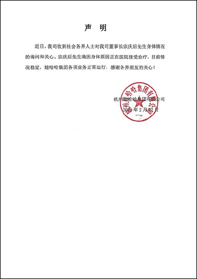 2月22日,娃哈哈集團在微博發(fā)布聲明稱,宗慶后因身體原因正在醫(yī)院接受治療,目前情況穩(wěn)定,娃哈哈集團各項業(yè)務(wù)正常運行。 此前,據(jù)澎湃新聞消息稱,娃哈哈創(chuàng)始人宗慶后正在浙江大學(xué)醫(yī)學(xué)院附屬邵逸夫醫(yī)院ICU病房救治,對此,騰訊新聞《一線》向宗慶后女兒宗馥莉本人求證,她回復(fù)稱:“我父親確實因為身體原因在醫(yī)院治療,目前情況穩(wěn)定,謝謝關(guān)心! 1945年出生的宗慶后今年已經(jīng)79歲。其最近一次公開出現(xiàn)在公眾面前,還是2023年3月18日,接受央視財經(jīng)頻道《對話》欄目專訪,主持人說,宗慶后是本季欄目中年齡最大的“老友”。 目前,宗慶后仍擔(dān)任娃哈哈集團董事長一職。其女宗馥莉擔(dān)任娃哈哈集團副董事長兼總經(jīng)理。 |