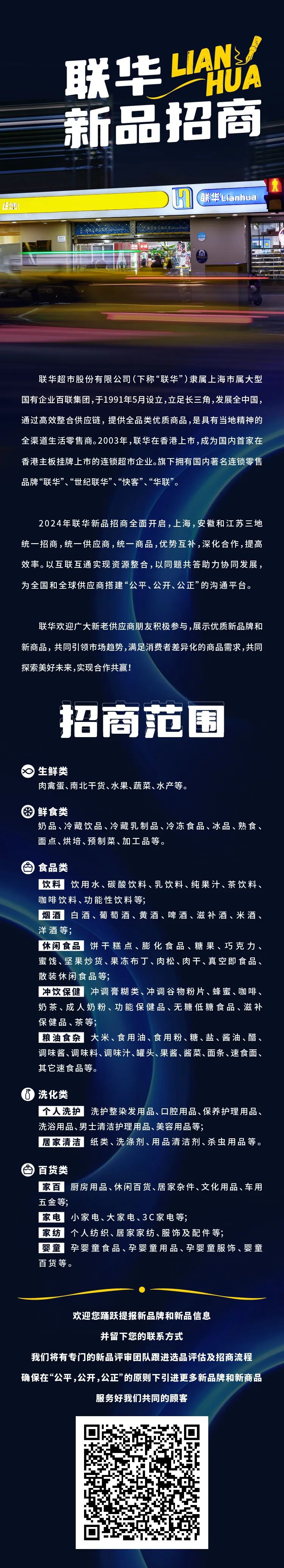 職業(yè)零售網(wǎng)獲悉,2月27日,聯(lián)華超市官方公眾號發(fā)布宣布,聯(lián)華新品招商開啟線上模式。 此次招商活動將覆蓋上海、安徽和江蘇三個地區(qū),實行統(tǒng)一招商、統(tǒng)一供應商和統(tǒng)一商品的策略,旨在深化合作、優(yōu)勢互補,并提升整體效率。 據(jù)悉,聯(lián)華超市此次的招商范圍相當廣泛,包括生鮮類、鮮食類、食品類、洗化類以及百貨類等五大主要品類。在更細分的層面上,還涵蓋了飲料、白酒、休閑食品、個人洗護、家電和家居百貨等多個小類。 資料顯示,聯(lián)華超市隸屬于百聯(lián)集團,成立于1995年,并于2003年上市,成為國內首家在香港主板掛牌上市的連鎖超市企業(yè)。旗下?lián)碛小奥?lián)華”、“世紀聯(lián)華”、“快客”、“華聯(lián)”等多個品牌。 |
