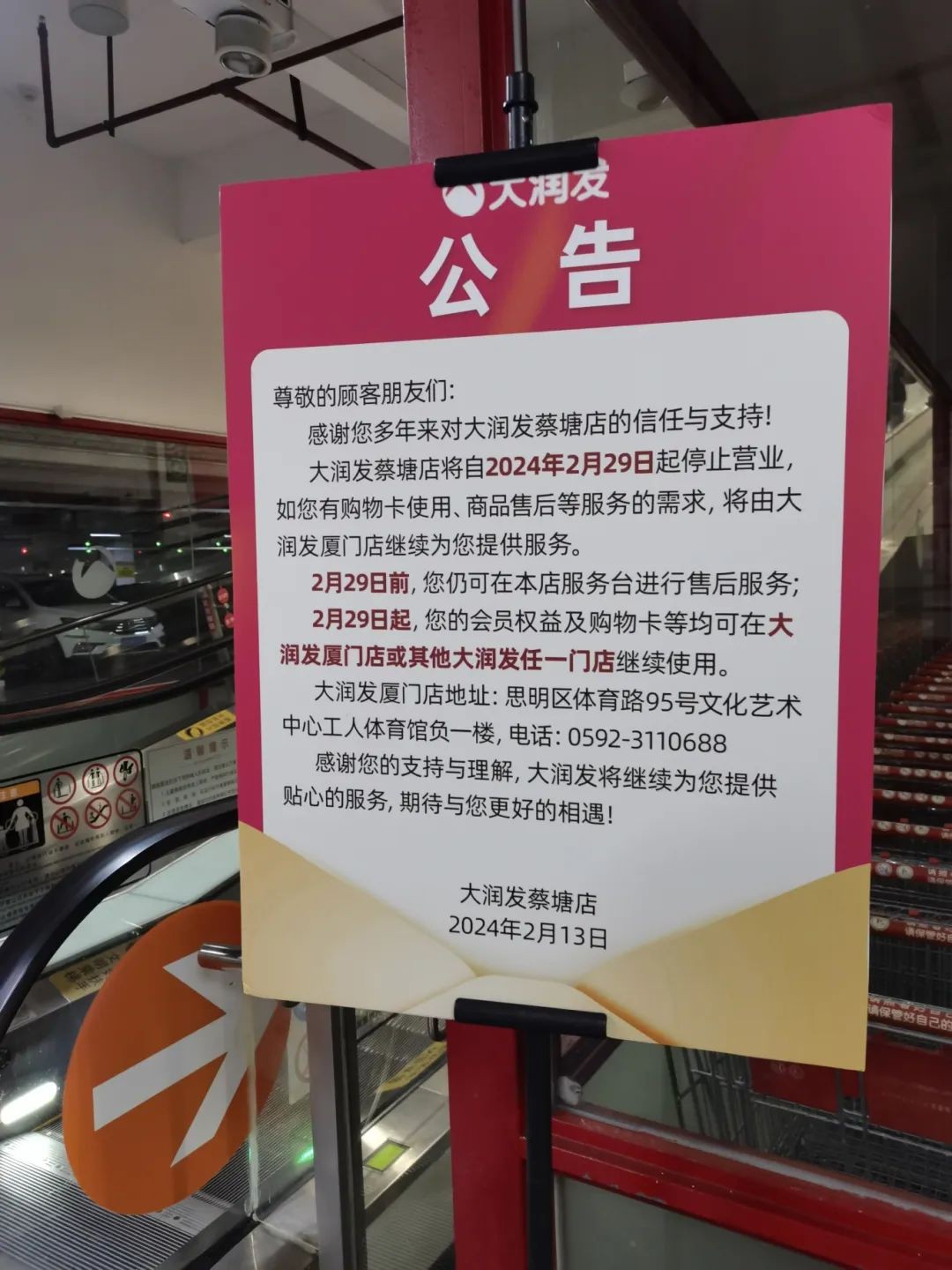 近日,位于福建廈門的大潤發(fā)蔡塘店宣布,將于2024年2月29日結(jié)束營業(yè),此前該店已在2月13日發(fā)出了停業(yè)通知。 公告顯示,大潤發(fā)蔡塘店將自2024年2月29日起停止營業(yè)如您有購物卡使用、商品售后等服務(wù)的需求,將由大潤發(fā)廈門店繼續(xù)為您提供服務(wù)。 在蔡塘店關(guān)閉之前,顧客仍可在店內(nèi)服務(wù)臺進行售后服務(wù)咨詢和處理。而自2月29日起,顧客的會員權(quán)益和購物卡將可以在大潤發(fā)廈門店或其他任何一家大潤發(fā)分店繼續(xù)使用。 根據(jù)大潤發(fā)官網(wǎng)提供的數(shù)據(jù),截至2月27日,大潤發(fā)在中國大陸地區(qū)已開設(shè)了512家大型超市,這些超市遍布華東、華北、東北、華中、華南五大區(qū)域,覆蓋了29個省市及自治區(qū)的230多個城市。其中,福建省內(nèi)的大潤發(fā)門店數(shù)量達到25家,包括泉州10家、福州、廈門、三明各3家,漳州2家,以及莆田、南平、龍巖、寧德各1家。 根據(jù)我們不完全統(tǒng)計,2月以來,大潤發(fā)已有4家門店宣布關(guān)閉,除了蔡塘店,還有株洲店、學(xué)府路店和德陽店。這些門店的關(guān)閉原因主要是由于租約到期和經(jīng)營調(diào)整所致。 針對近期關(guān)店潮,大潤發(fā)相關(guān)負責(zé)人對媒體表示,關(guān)閉和開業(yè)是公司區(qū)域經(jīng)營策略調(diào)整。在關(guān)閉部分門店的同時,大潤發(fā)也在積極尋找新的開店機會。據(jù)悉,今年3月,大潤發(fā)將在四川、湖北、江蘇、山東、浙江、廣東、海南多個省市開店,覆蓋大潤發(fā)、大潤發(fā)super、M會員商店三個業(yè)態(tài),整體保持門店穩(wěn)定增加狀態(tài)。 |