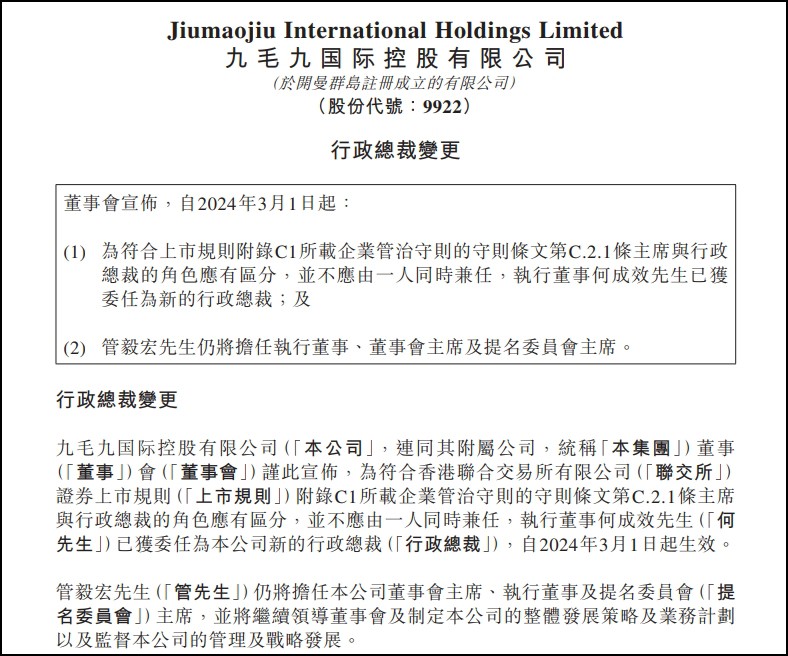 2月29日,九毛九國際控股有限公司宣布,自2024年3月1日起,為符合上市規(guī)則,執(zhí)行董事何成效先生將接替管毅宏先生成為新的行政總裁。管毅宏先生將繼續(xù)擔(dān)任執(zhí)行董事、董事會(huì)主席及提名委員會(huì)主席。 此次變動(dòng)是根據(jù)香港聯(lián)合交易所有限公司證券上市規(guī)則附錄C1所載企業(yè)管治守則第C.2.1條,主席與行政總裁角色應(yīng)區(qū)分,不得由同一人兼任。 何成效先生現(xiàn)年46歲,于2013年加入集團(tuán),曾任廣州太二餐飲連鎖有限公司總經(jīng)理,并在2020年7月2日被委任為執(zhí)行董事。何成效在品牌及運(yùn)營管理方面擁有豐富經(jīng)驗(yàn),曾于1999年至2013年在廣東三元麥當(dāng)勞食品有限公司工作,并在離開前擔(dān)任運(yùn)營經(jīng)理。他畢業(yè)于廣東外語外貿(mào)大學(xué),主修國際金融。何成效作為行政總裁及執(zhí)行董事,年薪為人民幣120萬元,另加福利及酌情花紅。 據(jù)悉,何成效持有本公司170.48萬股股份權(quán)益,包括153.48萬份購股權(quán)。他還持有MTJ Limited 2.1%的股權(quán),而MTJ Limited持有九毛九國際控股約2.6%的股權(quán)。 董事會(huì)確認(rèn),與何成效的任命無關(guān)的事宜無需通知聯(lián)交所或股東,并對(duì)他的加入表示歡迎。 |