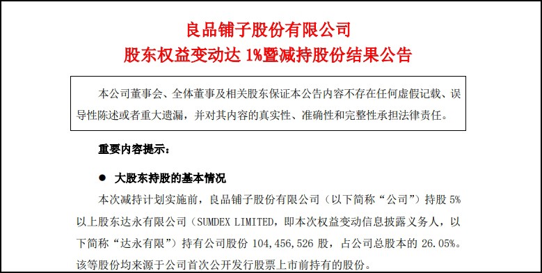 2月29日,良品鋪子股份有限公司發(fā)布股東權(quán)益變動暨減持股份結(jié)果公告。 公告顯示,該公司持股5%以上股東達永有限公司(SUMDEX LIMITED)自2024年1月24日至2月29日,通過集中競價交易及大宗交易方式合計減持公司股份4135000股,占公司總股本的1.03%,減持后仍持有公司23.05%的股份。 本次減持計劃實施前,達永有限持有公司股份104456526股,占總股本的26.05%。經(jīng)過減持,達永有限累計減持股份達到12030000股,占總股本的3%,完成減持計劃上限。 減持期間,其通過集中競價和大宗交易方式,分別在15.55-18.56元/股的價格區(qū)間內(nèi)進行操作,減持金額總計約1.9469億元。 公告強調(diào),本次權(quán)益變動為股東履行此前披露的減持計劃,不觸及要約收購,且不會對公司治理結(jié)構(gòu)及持續(xù)經(jīng)營產(chǎn)生重大影響。 |