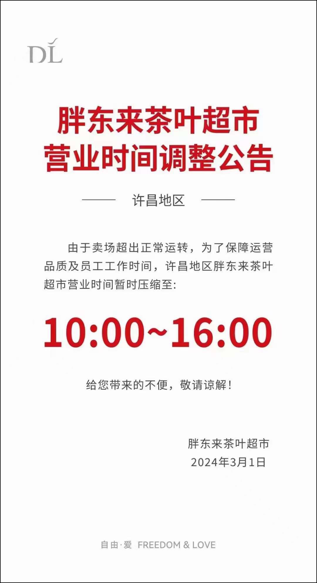3月1日,胖東來茶葉超市發(fā)表調(diào)整營業(yè)時間公告。 根據(jù)公告,因賣場超出正常運轉(zhuǎn),為了確保運營品質(zhì)和員工工作時間,許昌地區(qū)胖東來茶葉超市營業(yè)時間暫時調(diào)整為10:00至16:00。 這已經(jīng)是近期第二次縮短營業(yè)時間了。 去年12月27日,許昌地區(qū)胖東來茶葉超市營業(yè)時間暫時壓縮至10:30~18:00。相比之前,又縮短了兩個半小時的營業(yè)時間。 以“服務(wù)顧客、關(guān)愛員工”為先一直是胖東來秉承的理念,縮短營業(yè)時間一方面是為了保證產(chǎn)品的質(zhì)量,為顧客提供更優(yōu)質(zhì)的產(chǎn)品和服務(wù),另一方面也能確保員工有足夠的休息時間,一舉兩得,更是大愛的表現(xiàn)。 |