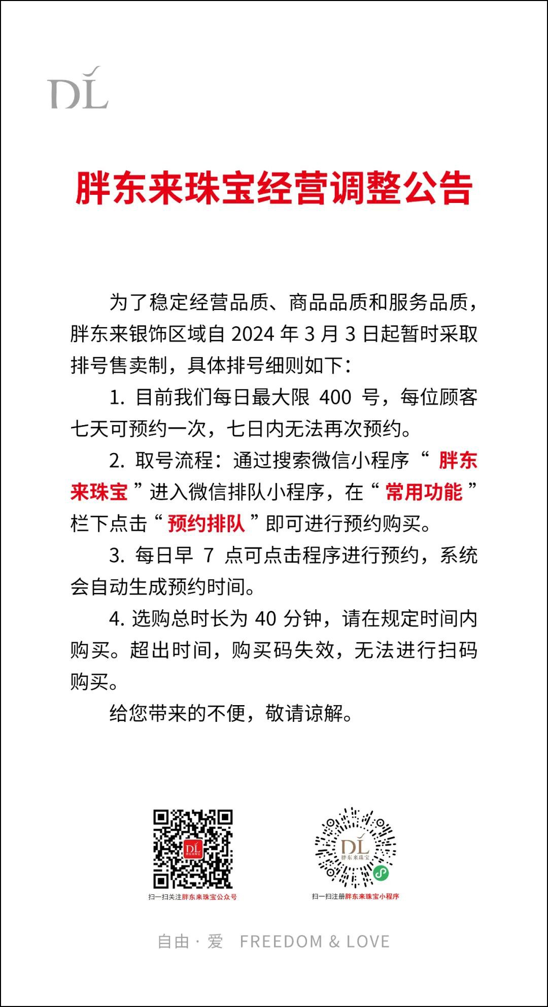 繼茶葉超市后,胖東來銀飾區(qū)也采取排號售賣制。 3月2日,胖東來官方發(fā)布一則珠寶經(jīng)營調(diào)整公告稱,為了穩(wěn)定經(jīng)營品質(zhì)、商品品質(zhì)和服務(wù)品質(zhì),自2024年3月3日起,胖東來銀飾區(qū)域暫時采取排號售賣制。 公告中表示,每日早上7點開始,在胖東來珠寶小程序進行預(yù)約排隊購買,每天限量400號,每位顧客7天可預(yù)約一次,七日內(nèi)無法再次預(yù)約。 此前,胖東來時代廣場店于2月28日發(fā)布銀飾區(qū)域限流公告,因銀飾區(qū)域客流量增加幾倍,超出賣場的正常運營,自2月29日起,胖東來銀飾營業(yè)時間為由此前的9:30—20:00改為9:30—17:00,時尚銀飾類、復(fù)古銀飾類暫停銷售。 值得的注意的是,此前爆火的胖東來茶葉超市,經(jīng)過壓縮營業(yè)時間、取排號售賣后,3月1日再次發(fā)布營業(yè)時間調(diào)整公告,昌地區(qū)胖東來茶葉超市營業(yè)時間暫時壓縮至:10:00~16:00,雖然營業(yè)時間有所減少,但消費者對其的熱情依舊不減。 |