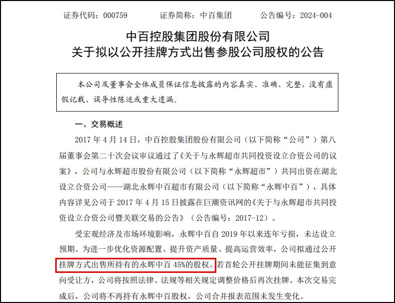 3月1日,中百集團(tuán)發(fā)布公告稱,公司擬通過公開掛牌方式出售所持有的永輝中百45%的股權(quán)。此舉是為進(jìn)一步優(yōu)化資源配置、提升資產(chǎn)質(zhì)量、提高運(yùn)營(yíng)效率。 公告中指出,受宏觀經(jīng)濟(jì)及市場(chǎng)環(huán)境影響,永輝中百自2019年以來連年虧損,其經(jīng)營(yíng)狀況未達(dá)設(shè)立預(yù)期。因此,中百集團(tuán)擬通過公開掛牌方式出售所持有的永輝中百45%的股權(quán)。由于此次交易方式為公開掛牌轉(zhuǎn)讓,交易對(duì)方、價(jià)格及成交結(jié)果均存在不確定性。若首輪公開掛牌未能征集到意向受讓方,公司將調(diào)整價(jià)格后再次掛牌。 此次股權(quán)轉(zhuǎn)讓完成后,中百集團(tuán)將不再持有永輝中百股權(quán),意味著中百集團(tuán)與永輝超市的合資模式正式告一段落。 資料顯示,2017年4月14日,中百控股集團(tuán)股份有限公司與永輝超市股份有限公司共同出資在湖北設(shè)立合資公司——湖北永輝中百超市有限公司。其中,永輝超市認(rèn)繳出資額5500萬股,持股比例55%;中百集團(tuán)認(rèn)繳出資額4500萬股,持股比例45%。 根據(jù)公告,永輝中百最近一年及最近一期經(jīng)審計(jì)財(cái)務(wù)數(shù)據(jù)均顯示虧損。具體來看,2022年全年和2023年上半年,永輝中百營(yíng)收分別為10.13億元和5.08億元,凈利潤(rùn)則分別虧損7167.38萬元和1949.12萬元。截至2023年上半年末,永輝中百凈資產(chǎn)為﹣10224.03萬元。 根據(jù)公告,永輝中百的財(cái)務(wù)數(shù)據(jù)并不樂觀。最近一年及最近一期的經(jīng)審計(jì)財(cái)務(wù)數(shù)據(jù)均顯示虧損。2022年全年和2023年上半年,永輝中百的營(yíng)收分別為10.13億元和5.08億元,而凈利潤(rùn)卻分別虧損了7167.38萬元和1949.12萬元。截至2023年上半年末,永輝中百的凈資產(chǎn)更是達(dá)到了-10224.03萬元的驚人數(shù)字。 與此同時(shí),中百集團(tuán)和永輝超市日子都不好過,兩家公司2023年業(yè)績(jī)均預(yù)計(jì)虧損。1月底,兩家公司分別發(fā)布了2023年度業(yè)績(jī)預(yù)告。其中,中百集團(tuán)預(yù)計(jì)2023年歸屬于上市公司股東的凈利潤(rùn)虧損2.55億元—3.63億元,扣非凈利潤(rùn)預(yù)計(jì)虧損2.62億元—3.73億元。 對(duì)于2023年預(yù)虧,中百集團(tuán)解釋稱,新興消費(fèi)形式不斷興起,線上線下競(jìng)爭(zhēng)更加激烈,直播電商、社區(qū)團(tuán)購(gòu)、即時(shí)配送等持續(xù)沖擊,消費(fèi)分流嚴(yán)重,公司經(jīng)營(yíng)的大賣場(chǎng)主要消費(fèi)群體及購(gòu)物習(xí)慣發(fā)生較大改變,獲客難度加大,客流持續(xù)減少,導(dǎo)致公司營(yíng)業(yè)收入下滑。此外,公司對(duì)虧損門店優(yōu)化調(diào)整而產(chǎn)生閉店損失。此外,因子公司員工邵某某涉嫌職務(wù)侵占資金,預(yù)估本年計(jì)提信用減值損失約0.5億元。 永輝超市則預(yù)計(jì)2023年歸屬于上市公司股東的凈利潤(rùn)虧損13.4億元,與上年同期相比減虧14.2億元;歸屬于上市公司股東扣除非經(jīng)常性損益后的凈利潤(rùn)-19.7億元,與上年同期相比減虧6.0億元。2021年和2022年,永輝超市分別虧損39.44億元和27.6億元。 |