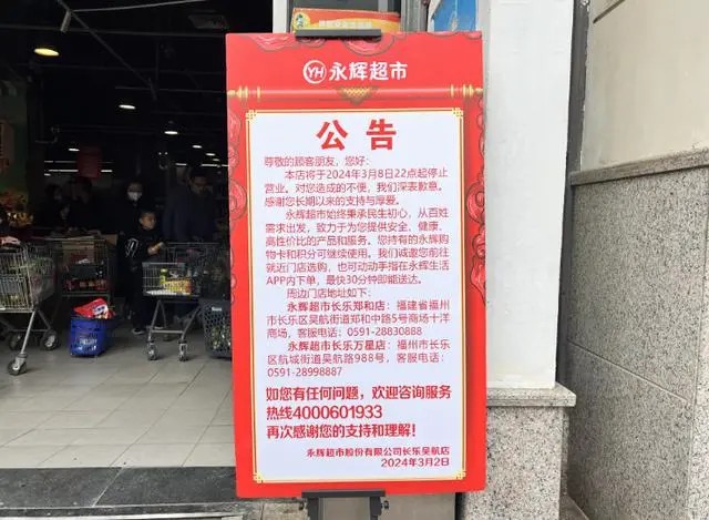 3月2日,永輝超市股份有限公司長樂吳航店發(fā)布停業(yè)公告稱,將于2024年3月8日22點起結(jié)束營業(yè)!這也意味著,這家陪伴了長樂市民15年的“老店”將和大家說再見了。 上午,記者在永輝超市吳航店看到,超市內(nèi)許多商品正在打折處理,吸引了不少顧客前來選購,一旁還有超市工作人員在解答問題。超市收銀區(qū),許多顧客正在排隊結(jié)算。 “我家就住在樓上,經(jīng)常來這逛一逛買些水果蔬菜和日用品,非常方便。這要關(guān)門了,還是挺舍不得的。”顧客陳女士說,在不少住在附近的居民心中,逛一逛永輝超市已經(jīng)成為生活中的一部分,對于這家門店即將退出市場,他們有些許錯愕,又夾雜著幾分惋惜! 記者從永輝超市了解到,永輝超市吳航店的清倉促銷活動截止到2024年3月8日,閉店后,消費者持有的永輝購物卡和積分可以通過周邊門店(永輝超市鄭和店/萬星店)或永輝生活A(yù)PP繼續(xù)使用。 |