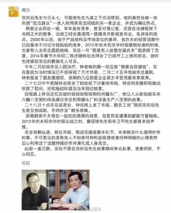3月3日消息,據(jù)金融界報道,農(nóng)夫山泉副總周力博士朋友圈文,回應(yīng)“捧‘娃哈哈’踩‘農(nóng)夫山泉’風(fēng)波”。 周力表示,宗慶后先生今日頭七,可能老先生九泉之下也沒想到,他的離世會被一些所謂“吃瓜群眾”一類人利用來攻擊同城的另一家企業(yè),并成為輿論熱點。兩家企業(yè)同處一城,早年雖有競爭,甚至對薄公堂,還是在法律框架下光明正大的競爭。 附原文: 宗慶后先生今日頭七,可能老先生九泉之下也沒想到,他的離世會被一些所謂“吃瓜群眾”一類人利用來攻擊同城的另一家企業(yè),并成為輿論熱點。兩家企業(yè)同處一城,早年雖有競爭,甚至對薄公堂,還是在法律框架下光明正大的競爭。 論戰(zhàn)之時會邀請同一撥媒體開新聞發(fā)布會,各講各的觀點。2000年以后,由于產(chǎn)品結(jié)構(gòu)及市場定位的差異,在農(nóng)夫的經(jīng)營話題中已經(jīng)基本不討論與娃哈哈的競爭,2013年農(nóng)夫和京華時報硬剛標(biāo)準(zhǔn)的時候也曾有人去宗總面前挑唆,宗總一句“那是有人故意在搞農(nóng)夫”就表明了態(tài)度。2014年春節(jié)大年初二我還隨鐘總?cè)グ輹艘呀?jīng)開工上班的宗總,彼時也還感嘆宗總的勤奮無人可及。 今年二月初聞宗總?cè)朐褐委,鐘老板的第一反?yīng)是“我要去探望他”,實在是因為當(dāng)時情況已不容探視了方才作罷,二月二十五號驚聞宗總耗,鐘老板發(fā)了朋友圈感嘆,浙商的幾位前輩企業(yè)家太辛苦而都未享高壽。二十七日中午我隨鐘總就去了娃哈哈下沙基地吊唁,鐘總向宗馥莉和施幼珍致了慰問,還和施幼珍提及當(dāng)年到過她家;爻搪飞乡娍傔憶及彼時娃哈哈剛收購杭州罐頭廠,他讓人從新加坡買來六罐八寶粥的樣品建議宗總利用罐頭廠的設(shè)備生產(chǎn)八寶粥的故事。二十八日十點宗總追思會,鐘總網(wǎng)上發(fā)了吊唁,跟員工說“我和宗慶后先生是互相成就,亦師亦友”頗多感慨。浙商群體不太有在一起吃吃喝喝的場景,但是其實遇事卻都能守望相助。2013年農(nóng)夫和京華時報論戰(zhàn)之時,魯冠球先生和宋衛(wèi)平先生都曾來信聲援。 宗總駕鶴仙逝,前往吊唁,敬送花圈是基本禮節(jié),本來就沒什么值得吵作的事。不可思議的是有些人不知受何種利益驅(qū)使或者何種陰暗的心理竟然忍心利用這個話題持續(xù)炒作并演化成人身攻擊。此前一直沉默,實在不愿在宗慶后先生喪事期間爭論此事,逝者何安,于心何忍。 |