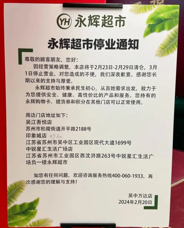 3月4日消息,蘇州永輝超市位于吳中萬達(dá)廣場(chǎng)的門店近日宣布結(jié)束營業(yè)。 該店自2015年開業(yè),作為第一批入駐品牌商家,服務(wù)當(dāng)?shù)鼐用耖L達(dá)8年。近期,消費(fèi)者發(fā)現(xiàn)該店已關(guān)閉,門口貼出“旺鋪招租”標(biāo)識(shí)。永輝超市提示持有購物卡、提貨券和積分的消費(fèi)者可在蘇州其他門店使用。 近年來,永輝超市面臨連續(xù)虧損,2023年預(yù)計(jì)凈利潤虧損13.4億元。自2019年以來,永輝超市開始大規(guī)模閉店,從曾經(jīng)的超千家門店縮減至目前997家。面對(duì)市場(chǎng)轉(zhuǎn)變,永輝嘗試轉(zhuǎn)型,如開設(shè)食堂、快餐店,并在云南昆明開出全國首家“定制版”旗艦店,以期探索新的商業(yè)模式。 |
