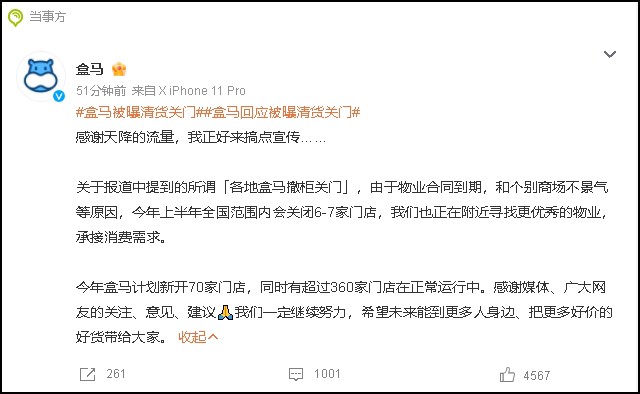 近日,有媒體稱,各地盒馬傳出撤柜關(guān)門(mén)的消息,引發(fā)關(guān)注。3月6日,盒馬發(fā)文稱,關(guān)店是因?yàn)槲飿I(yè)合同到期和個(gè)別商場(chǎng)不景氣等原因,今年上半年全國(guó)范圍內(nèi)會(huì)關(guān)閉6-7家門(mén)店。 全文如下: 感謝天降的流量,我正好來(lái)搞點(diǎn)宣傳…… 關(guān)于報(bào)道中提到的所謂「各地盒馬撤柜關(guān)門(mén)」,由于物業(yè)合同到期、和個(gè)別商場(chǎng)不景氣等原因,今年上半年全國(guó)范圍內(nèi)會(huì)關(guān)閉6-7家門(mén)店,我們也正在附近尋找更優(yōu)秀的物業(yè),承接消費(fèi)需求。 今年盒馬計(jì)劃新開(kāi)70家門(mén)店,同時(shí)有超過(guò)360家門(mén)店在正常運(yùn)行中。感謝媒體、廣大網(wǎng)友的關(guān)注、意見(jiàn)、建議。我們一定繼續(xù)努力,希望未來(lái)能到更多人身邊、把更多好價(jià)的好貨帶給大家。 最近,各地盒馬撤柜關(guān)門(mén)的消息,源源不斷地冒出來(lái)。有網(wǎng)友發(fā)現(xiàn),自己買(mǎi)的盒馬商品沒(méi)人送貨。送來(lái)的東西日期不新鮮,種類也變少了,愛(ài)喝的蘋(píng)果汁下架了,常買(mǎi)的雞肉也斷貨了。網(wǎng)上還有人貼出盒馬貨架被清空,既沒(méi)人補(bǔ)貨,店里也沒(méi)有顧客的照片時(shí)。 |
