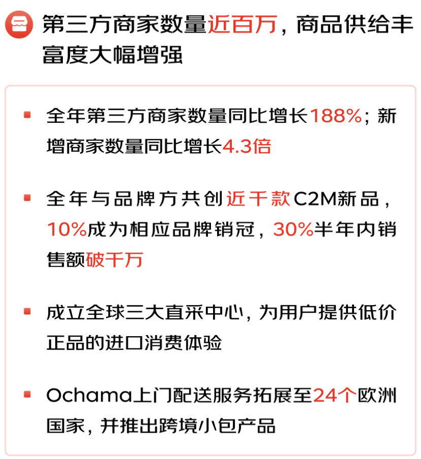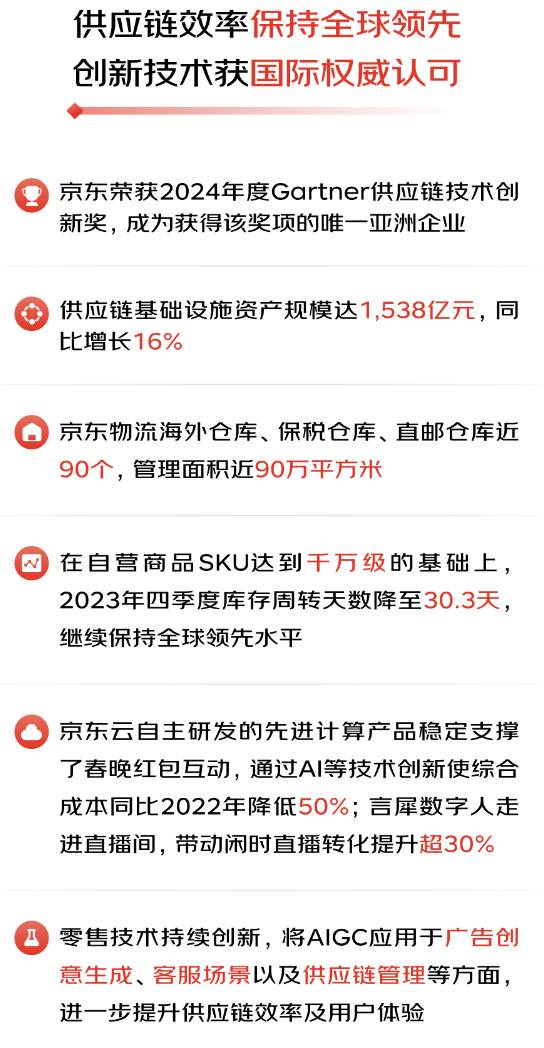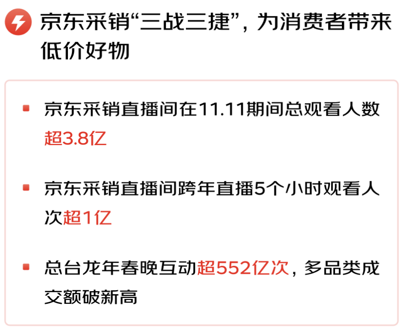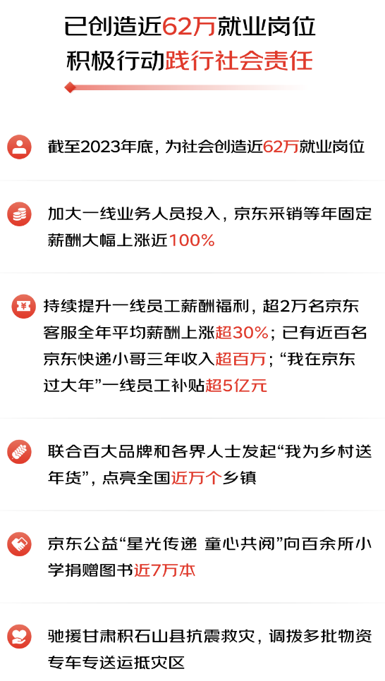 3月6日,京東集團(tuán)發(fā)布了2023年四季度及全年業(yè)績(jī),受益于過(guò)去一年來(lái)堅(jiān)定的戰(zhàn)略執(zhí)行、激昂的團(tuán)隊(duì)斗志和破圈的業(yè)務(wù)創(chuàng)新,始終把用戶體驗(yàn)放在首位,通過(guò)降低成本、提升效率為消費(fèi)者、品牌和商家創(chuàng)造實(shí)實(shí)在在的價(jià)值,不僅保持了業(yè)績(jī)?cè)鲩L(zhǎng)的超預(yù)期,更帶動(dòng)了品牌、商家和京東駛?cè)肓夹园l(fā)展通道。 2023年,京東集團(tuán)繼續(xù)保持穩(wěn)健增長(zhǎng),四季度收入達(dá)到3,061億元人民幣(約431億美元),同比增長(zhǎng)3.6%;全年收入10,847億元人民幣(約1,528億美元),同比增長(zhǎng)3.7%;作為核心品類(lèi)的電子產(chǎn)品及家用電器商品收入同比增速在四季度繼續(xù)保持高于行業(yè)平均水平,日用百貨商品收入同比實(shí)現(xiàn)正增長(zhǎng)。在免傭降費(fèi)等大力扶持中小商家運(yùn)營(yíng)的舉措下,四季度服務(wù)收入仍達(dá)到596億元人民幣(約84億美元),全年服務(wù)收入達(dá)2,134億元人民幣(約301億美元),同比增長(zhǎng)17.8%。2023年,京東物流服務(wù)外部客戶的收入同比增長(zhǎng)了30.8%,其中一體化供應(yīng)鏈單客戶平均收入同比增長(zhǎng)15.2%。 對(duì)“多快好省”用戶體驗(yàn)的極致追求和近百萬(wàn)商家的繁榮生態(tài),帶動(dòng)了京東的季度活躍用戶數(shù)在四季度實(shí)現(xiàn)加速增長(zhǎng),用戶平均購(gòu)物頻次也在持續(xù)提升。2023年,第三方商家數(shù)量同比增長(zhǎng)了188%,一年內(nèi)新增商家數(shù)量同比增長(zhǎng)4.3倍。 四季度,京東集團(tuán)在非美國(guó)通用會(huì)計(jì)準(zhǔn)則下歸屬于上市公司普通股股東的凈利潤(rùn)為84億元人民幣(約12億美元),全年達(dá)到352億元人民幣(約50億美元),均超出市場(chǎng)預(yù)期。 3月6日,京東集團(tuán)同步公告稱(chēng),公司董事會(huì)已批準(zhǔn)年度現(xiàn)金股利,股利總額約為12億美元,超出2023年的10億美元。京東集團(tuán)董事會(huì)同時(shí)批準(zhǔn)一項(xiàng)新股份回購(gòu)計(jì)劃,于現(xiàn)有股份回購(gòu)計(jì)劃屆滿生效后,可在截至2027年3月的未來(lái)36個(gè)月內(nèi)回購(gòu)價(jià)值不超過(guò)30億美元的股份。 截至2023年底,京東已為近62萬(wàn)人創(chuàng)造了高質(zhì)量的就業(yè)崗位。2023年全年的人力資源總支出(包括公司的自有員工和外部人員)達(dá)到了1,047億元人民幣。從2024年初開(kāi)始,京東提升了采銷(xiāo)、客服等員工的薪酬激勵(lì)和福利保障。 “隨著四季度收入和盈利能力的提升,我們很高興以強(qiáng)勁的勢(shì)頭收官2023年,”京東集團(tuán)首席執(zhí)行官許冉女士表示。“京東采取的主動(dòng)調(diào)整措施已見(jiàn)成效,對(duì)用戶體驗(yàn)、價(jià)格競(jìng)爭(zhēng)力和平臺(tái)生態(tài)的明確堅(jiān)定的戰(zhàn)略聚焦為我們帶來(lái)更深層、更高頻次的用戶參與度,以及更健康的用戶增長(zhǎng)趨勢(shì)。2024年,我們將以用戶體驗(yàn)提升和市場(chǎng)份額增長(zhǎng)為重點(diǎn),為用戶、業(yè)務(wù)合作伙伴和股東創(chuàng)造更多價(jià)值! 01 京東采銷(xiāo)“三戰(zhàn)三捷” 京東服務(wù)引領(lǐng)行業(yè)標(biāo)桿 用戶體驗(yàn)是京東做事的起點(diǎn)和終點(diǎn),豐富商品、優(yōu)化價(jià)格、提升服務(wù)是用戶體驗(yàn)的核心,也是京東的發(fā)力點(diǎn)。 從2023年初啟動(dòng)以來(lái),“春曉計(jì)劃”不斷升級(jí),通過(guò)簡(jiǎn)化入駐流程、減費(fèi)降扣、流量激勵(lì)、經(jīng)營(yíng)工具提效等加大對(duì)中小商家的扶持力度,在商家數(shù)量大幅增長(zhǎng)的同時(shí),也為消費(fèi)者帶來(lái)了更加豐富的商品選擇。截至2023年底,京東三方商家數(shù)量已近百萬(wàn),三方商家的商品SKU數(shù)量較年初增長(zhǎng)了近一倍。 2023年,京東借助智能供應(yīng)鏈與品牌商共創(chuàng)了近千款C2M新品,其中10%成為了相應(yīng)品牌的銷(xiāo)量冠軍,有30%在半年內(nèi)的銷(xiāo)售額突破千萬(wàn)。京東還在日本、韓國(guó)及歐洲設(shè)立三大直采中心,通過(guò)在全球構(gòu)建京東自營(yíng)買(mǎi)手網(wǎng)絡(luò),不斷提升國(guó)際供應(yīng)鏈能力,滿足了消費(fèi)者多元化的低價(jià)正品進(jìn)口消費(fèi)體驗(yàn)。 京東采銷(xiāo)四季度以來(lái)“三戰(zhàn)三捷”,為用戶推薦了海量的極致性價(jià)比商品,讓京東的低價(jià)形象更加深入人心。 在11.11期間,京東采銷(xiāo)直播火爆出圈,總觀看人數(shù)突破3.8億;隨后在京東獨(dú)家冠名的湖南衛(wèi)視芒果TV跨年晚會(huì),與晚會(huì)同頻進(jìn)行的京東采銷(xiāo)直播間5個(gè)小時(shí)內(nèi)觀看人次超1億;作為中央廣播電視總臺(tái)2024年春節(jié)聯(lián)歡晚會(huì)獨(dú)家互動(dòng)合作平臺(tái),春晚期間用戶在京東的互動(dòng)量超552億次,京東采銷(xiāo)在“春晚同款”會(huì)場(chǎng)推薦的熱門(mén)商品銷(xiāo)售火爆。 在豐富商品供給和增加高性價(jià)比商品的同時(shí),2023年,京東相繼推出了“百億補(bǔ)貼”、“9塊9包郵”頻道,以及免郵門(mén)檻下調(diào)等一系列低價(jià)舉措。在已有9成第三方商品包郵的基礎(chǔ)上,今年3月底將對(duì)其余近10%第三方商品普及最高滿59元包郵。 京東服務(wù)始