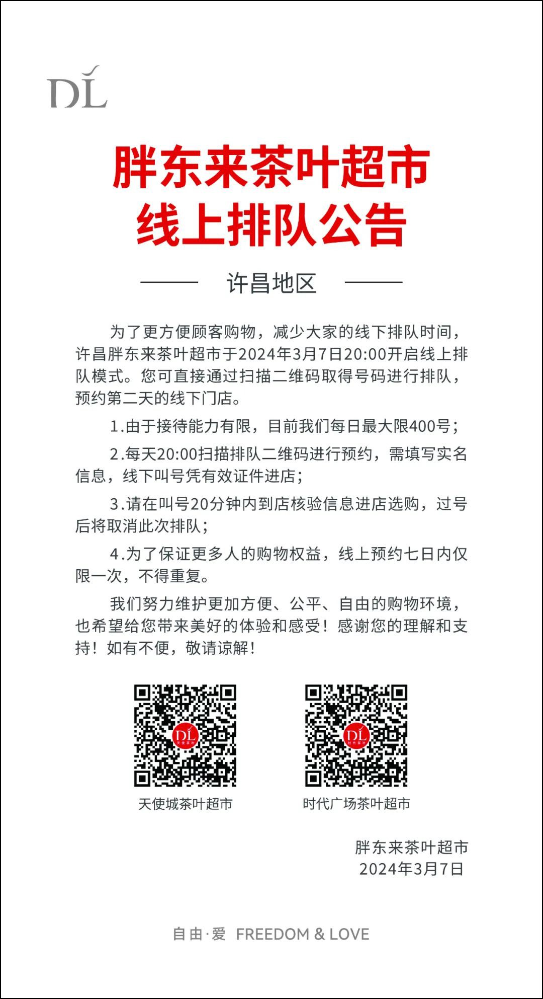 3月7日,胖東來(lái)茶葉超市發(fā)布線(xiàn)上排隊(duì)公告。 為了方便顧客購(gòu)物,減少大家的線(xiàn)下排隊(duì)時(shí)間,許昌胖東來(lái)茶葉超市于2024年3月7日20:00開(kāi)啟線(xiàn)上排隊(duì)模式。您可以直接通過(guò)掃描二維碼取得號(hào)碼進(jìn)行排隊(duì),預(yù)約第二天的線(xiàn)下門(mén)店。 一是由于接待能力有限,目前我們每日最大限400號(hào);二是,每天20:00掃碼排隊(duì)二維碼進(jìn)行預(yù)約,需填寫(xiě)是實(shí)名信息,線(xiàn)下叫號(hào)憑有效證據(jù)進(jìn)店;三是請(qǐng)?jiān)诮刑?hào)20分鐘內(nèi)到店核驗(yàn)信息進(jìn)店選購(gòu),過(guò)號(hào)后將取消此次排隊(duì);四是為了保證更多人的購(gòu)物權(quán)益,線(xiàn)上預(yù)約七日內(nèi)僅限一次,不得重復(fù)。 此前,前后兩次調(diào)整營(yíng)業(yè)時(shí)間。最近一次是3月1日,許昌地區(qū)胖東來(lái)茶葉超市營(yíng)業(yè)時(shí)間暫時(shí)調(diào)整為為10:00至16:00。去年12月27日,許昌地區(qū)胖東來(lái)茶葉超市營(yíng)業(yè)時(shí)間暫時(shí)壓縮至10:30~18:00。相比之前,又縮短了兩個(gè)半小時(shí)的營(yíng)業(yè)時(shí)間。 |