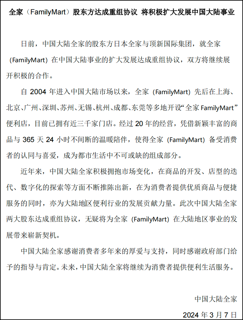 近期有消息稱,日本全家將縮小其與頂新集團(tuán)在中國(guó)市場(chǎng)的合資業(yè)務(wù)范圍。雙方將成立新的合資公司,此后的華東地區(qū)由該合資公司運(yùn)營(yíng),而中國(guó)華南、華北和西南的全家業(yè)務(wù)市場(chǎng),則將采用連鎖加盟制度來拓展業(yè)務(wù),在維持全家品牌的同時(shí),由頂新集團(tuán)負(fù)責(zé)店鋪的運(yùn)營(yíng)。 對(duì)此,3月7日,全家FamilyMart方面表示,日前中國(guó)大陸全家的股東方日本全家與頂新國(guó)際集團(tuán),就全家(FamilyMart)在中國(guó)大陸事業(yè)的擴(kuò)大發(fā)展達(dá)成重組協(xié)議,雙方將繼續(xù)展開合作。 據(jù)了解,全家品牌于1972年創(chuàng)立于日本,目前已成為亞洲最大的連鎖便利店之一。日本全家與頂新集團(tuán)在2000年左右簽署品牌授權(quán)合作,2004年,全家便利店在中國(guó)大陸的合資公司——上海福滿家便利有限公司獲商務(wù)部批準(zhǔn)成立,全家品牌正式進(jìn)入中國(guó)市場(chǎng)。 具體股權(quán)架構(gòu)上,頂新集團(tuán)的全資子公司頂全(開曼島)控股有限公司持有中國(guó)大陸全家59.65%股權(quán),中國(guó)臺(tái)灣全家持有中國(guó)大陸全家18.3%股權(quán),其余股權(quán)由日本全家、伊藤忠商事株式會(huì)社、FMCH(FamilyMart China Holding)持有。 自進(jìn)入中國(guó)大陸市場(chǎng)以來,憑借豐富的商品與365天24小時(shí)不間斷的服務(wù),先后在上海、北京、廣州、深圳、蘇州、無錫、杭州、成都、東莞等多地開設(shè)“全家FamilyMart”便利店,目前已擁有近3000家門店。其中,超過2000家店都位于江浙滬,僅是上海的門店數(shù)量就多達(dá)1400家。 雖然近年來門店數(shù)量有所波動(dòng),但全家便利店始終積極應(yīng)對(duì)市場(chǎng)變化,不斷優(yōu)化運(yùn)營(yíng)策略,以滿足消費(fèi)者的多元化需求。根據(jù)中國(guó)連鎖經(jīng)營(yíng)協(xié)會(huì)數(shù)據(jù)顯示,全家從2019年~2021年的門店統(tǒng)計(jì)數(shù)據(jù)分別為2856家、2967家、2902家,呈現(xiàn)出一種先增長(zhǎng)后下降的趨勢(shì)。然而,到了2022年,他們的門店數(shù)量減少了236家,降至2666家,成為唯一一個(gè)門店數(shù)量下滑的日資便利店品牌。 盡管如此,全家便利店仍然憑借敏銳的市場(chǎng)洞察力和用戶洞察力,積極進(jìn)行優(yōu)化調(diào)整。2023年,全家于上海推出第五代店型,全面開啟“一日五餐”策略,滿足消費(fèi)者在不同時(shí)段的多元、即時(shí)需求。 在當(dāng)前便利店業(yè)態(tài)競(jìng)爭(zhēng)激烈的情況下,此次中國(guó)大陸全家兩大股東達(dá)成重組協(xié)議,將給予頂新國(guó)際集團(tuán)在華東市場(chǎng)以外更多發(fā)展空間,促使其擁有更大權(quán)限,同時(shí)也對(duì)未來全家在全國(guó)的擴(kuò)張也帶來了更多優(yōu)勢(shì)。 全家在聲明中表示,近年來,“中國(guó)大陸全家積極擁抱市場(chǎng)變化,在商品的開發(fā)、店型的迭代、數(shù)字化的探索等方面不斷推陳出新,在為消費(fèi)者提供優(yōu)質(zhì)商品與便捷服務(wù)的同時(shí),亦為大陸地區(qū)便利行業(yè)的發(fā)展貢獻(xiàn)力量。此次中國(guó)大陸全家兩大股東達(dá)成重組協(xié)議,無疑將為全家(FamilyMart)在大陸地區(qū)事業(yè)的發(fā)展帶來嶄新契機(jī)。中國(guó)大陸全家感謝消費(fèi)者多年來的厚愛與支持,同時(shí)感謝政府部門給予的指導(dǎo)與肯定。未來,中國(guó)大陸全家將繼續(xù)為消費(fèi)者提供便利生活服務(wù)”。 值得注意的是,此前據(jù)彭博社報(bào)道,日本全家(日本全家FamilyMart株式會(huì)社)與其中國(guó)合作伙伴頂新集團(tuán)有過授權(quán)經(jīng)營(yíng)糾紛,并在開曼群島法院起訴頂新集團(tuán),但以敗訴告終,后續(xù)矛盾進(jìn)一步升級(jí)。此次雙方達(dá)成重組協(xié)議,也算是為此前矛盾畫上小的句號(hào)。 但目前,至于具體如何重組,全家并未透露。 附聲明全文: 日前,中國(guó)大陸全家的股東方日本全家與頂新國(guó)際集團(tuán),就全家(FamilyMart)在中國(guó)大陸事業(yè)的擴(kuò)大發(fā)展達(dá)成重組協(xié)議,雙方將繼續(xù)展開積極的合作。 自2004年進(jìn)入中國(guó)大陸市場(chǎng)以來,全家(FamilyMart)先后在上海、北京、廣州、深圳、蘇州、無錫、杭州、成都、東莞等多地開設(shè)“全家 FamilyMart”便利店, 目前已擁有近三千家門店。 經(jīng)過20年的經(jīng)營(yíng),憑借新穎豐富的商品與365天24小時(shí)不間斷的溫暖陪伴,使得全家(FamilyMart)備受消費(fèi)者的認(rèn)同與喜愛,成為都市生活中不可或缺的組成部分。 近年來,中國(guó)大陸全家積極擁抱市場(chǎng)變化,在商品的開發(fā)、店型的迭代、數(shù)字化的探索等方面不斷推陳出新,在為消費(fèi)者提供優(yōu)質(zhì)商品與便捷服務(wù)的同時(shí),亦為大陸地區(qū)便利行業(yè)的發(fā)展貢獻(xiàn)力量。此次中國(guó)大陸全家兩大股東達(dá)成重組協(xié)議,無疑將為全家(FamilyMart)在大陸地區(qū)事業(yè)的發(fā)展帶來嶄新契機(jī)。 中國(guó)大陸全家感謝消費(fèi)者多年來的厚愛與支持,同時(shí)感謝政府部門給予的指導(dǎo)與肯定。未來,中國(guó)大陸全家將繼續(xù)為消費(fèi)者提供便利生活服務(wù)。 中國(guó)大陸全家 2024年3月7日 |
