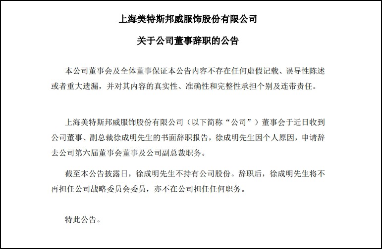 3月8日,美邦服飾發(fā)布關于公司董事辭職的公告。 據(jù)公告披露,美邦服飾董事會收到公司董事、副總裁徐成明先生的書面辭職報告。徐成明先生因個人原因,決定辭去公司第六屆董事會董事及公司副總裁職務。該辭職報告已正式生效。 截至公告披露日,徐成明先生并未持有美邦服飾的任何股份。辭職后,他將不再擔任公司戰(zhàn)略委員會委員,同時也不在公司擔任其他任何職務。 美邦服飾在公告中表示,徐成明先生在任職期間,為公司的發(fā)展做出了重要貢獻,公司對其表示衷心的感謝。同時,公司也將按照相關法律規(guī)定,盡快完成董事的補選工作,以確保公司董事會的正常運作。 |