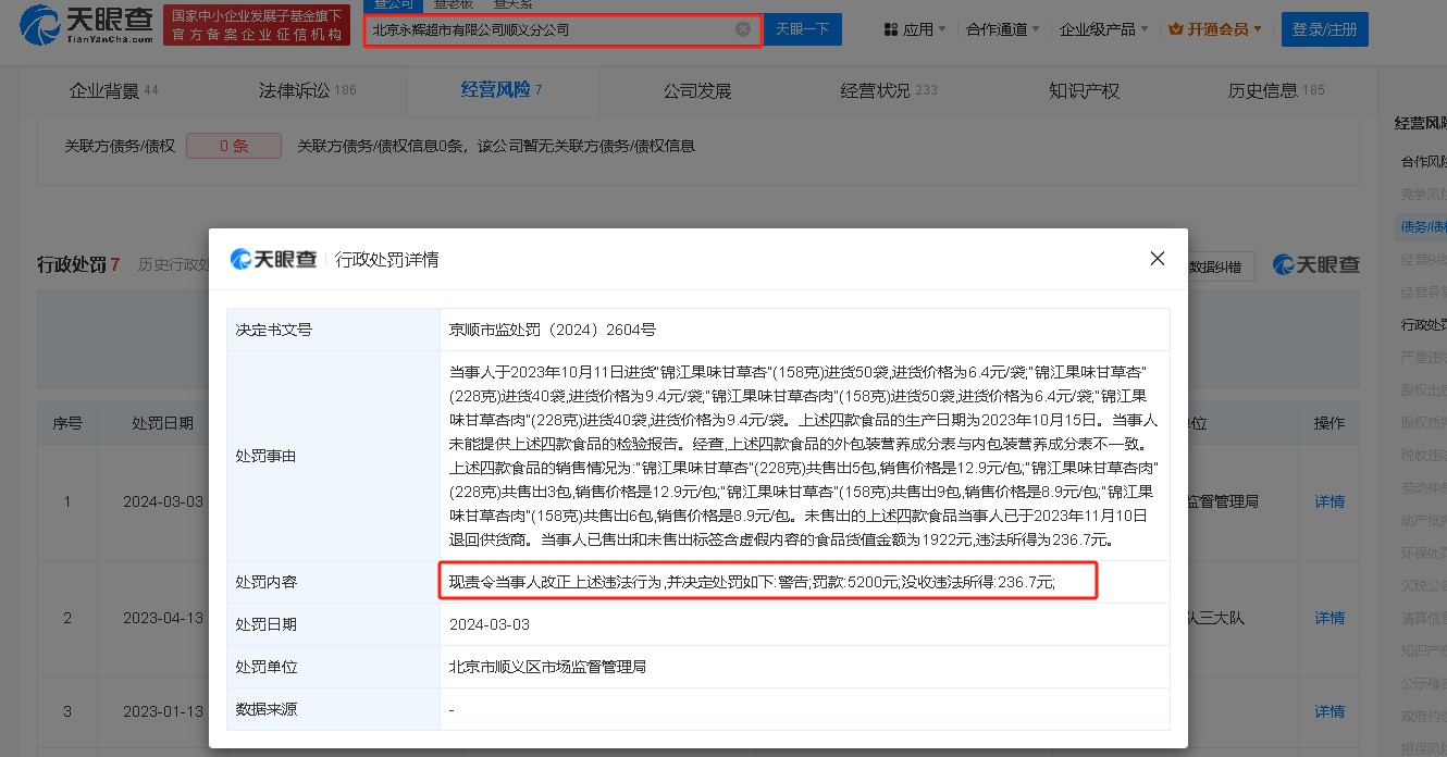 3月10日消息,據(jù)天眼查平臺顯示,北京永輝超市有限公司順義分公司近期因為存在違法行為,遭到了北京市順義區(qū)市場監(jiān)督管理局的行政處罰。 永輝超市該分公司的具體違法行為是2023年10月11日,該公司進貨“錦江果味甘草杏”(158克)進貨50袋,進貨價格為6.4元/袋;“錦江果味甘草杏”(228克)進貨40袋,進貨價格為9.4元/袋;“錦江果味甘草杏肉”(158克)進貨50袋,進貨價格為6.4元/袋;“錦江果味甘草杏肉”(228克)進貨40袋,進貨價格為9.4元/袋。上述四款食品的生產(chǎn)日期為2023年10月15日。 但是永輝超市順義分公司未能提供上述四款食品的檢驗報告。經(jīng)查,上述四款食品的外包裝營養(yǎng)成分表與內(nèi)包裝營養(yǎng)成分表不一致。 永輝超市順義分公司已售出和未售出標簽含虛假內(nèi)容的食品貨值金額為1922元,違法所得為236.7元。 最終該公司被罰款5200元并沒收違法所得236.7元。 |