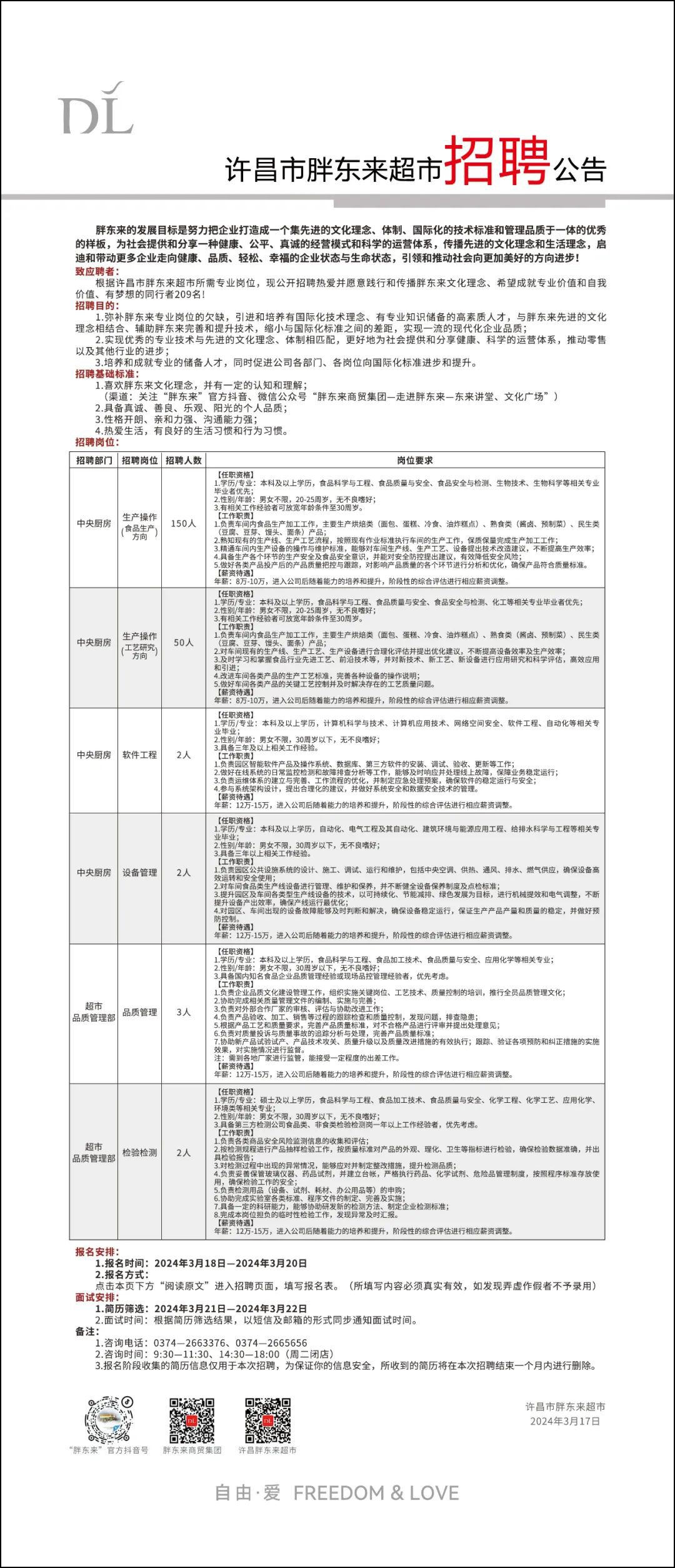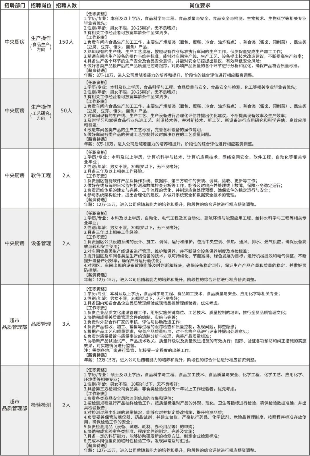 《職業(yè)零售網》獲悉,3月17日,胖東來商貿集團在其官方公眾號上發(fā)布了《許昌市胖東來超市招聘公告》,宣布公開招聘超市專業(yè)崗位209名。 具體招聘的職位包括中央廚房生產操作(涉及食品生產和工藝研究)200名,中央廚房軟件工程和中央廚房設備管理各2名,以及超市品質管理部的品質管理和檢驗檢測崗位各3名和2名。 值得注意的是,對于中央廚房生產操作崗位,應聘者需具備本科學歷,年薪在8萬至10萬元之間;而超市品質管理部的應聘者則需要本科學歷,年薪在12萬至15萬元之間。 具體招聘內容如下: 胖東來的發(fā)展目標是努力把企業(yè)打造成一個集先進的文化理念、體制、國際化的技術標準和管理品質于一體的優(yōu)秀樣板,為社會提供和分享一種健康、公平、真誠的經營模式和科學的運營體系,傳播先進的文化理念和生活理念,啟迪和帶動更多企業(yè)走向健康、品質、輕松、幸福的企業(yè)狀態(tài)與生命狀態(tài),引領和推動社會向更加美好的方向進步! 致應聘者: 根據許昌市胖東來超市所需專業(yè)崗位,現公開招聘熱愛并愿意踐行和傳播胖東來文化理念、希望成就專業(yè)價值和自我價值、有夢想的同行者209名! 招聘目的: 1.彌補胖東來專業(yè)崗位的欠缺,引進和培養(yǎng)有國際化技術理念、有專業(yè)知識儲備的高素質人才,與胖東來先進的文化理念相結合、輔助胖東來完善和提升技術,縮小與國際化標準之間的差距,實現一流的現代化企業(yè)品質; 2.實現優(yōu)秀的專業(yè)技術與先進的文化理念、體制相匹配,更好地為社會提供和分享健康、科學的運營體系,推動零售以及其他行業(yè)的進步; 3.培養(yǎng)和成就專業(yè)的儲備人才,同時促進公司各部門、各崗位向國際化標準進步和提升。 招聘基礎標準: 1.喜歡胖東來文化理念,并有一定的認知和理解; (渠道:關注“胖東來”官方抖音、微信公眾號“胖東來商貿集團—走進胖東來—東來講堂、文化廣場”) 2.具備真誠、善良、樂觀、陽光的個人品質; 3.性格開朗、親和力強、溝通能力強; 4.熱愛生活,有良好的生活習慣和行為習慣。 招聘崗位: 報名安排: 1.報名時間:2024年3月18日—2024年3月20日 2.報名方式: 點擊復制鏈接打開"https://azpdl.zhiye.com/social"進入招聘頁面,填寫報名表。(所填寫內容必須真實有效,如發(fā)現弄虛作假者不予錄用) 面試安排: 1.簡歷篩選:2024年3月21日—2024年3月22日 2.面試時間:根據簡歷篩選結果,以短信及郵箱的形式同步通知面試時間。 備注: 1.咨詢電話:0374—2663376、0374—2665656 2.咨詢時間:9:30—11:30、14:30—18:00(周二閉店) 3.報名階段收集的簡歷信息僅用于本次招聘,為保證你的信息安全,所收到的簡歷將在本次招聘結束一個月內進行刪除。 許昌市胖東來超市 2024年3月17日 |
