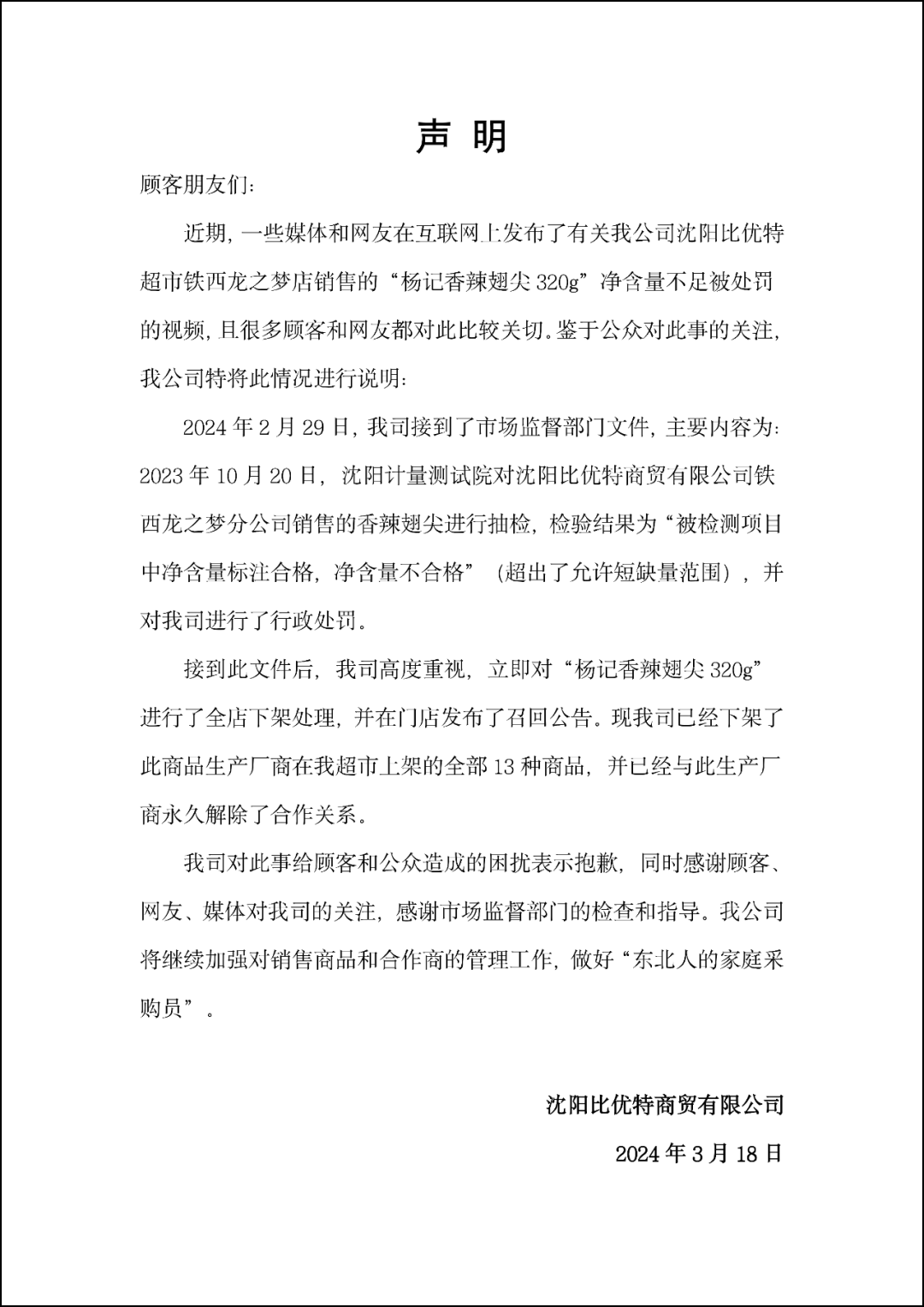 近日,東北知名超市比優(yōu)特因銷售的一款香辣翅尖產(chǎn)品凈含量不合格,被沈陽(yáng)市鐵西區(qū)市場(chǎng)監(jiān)督管理局處以0.95萬(wàn)元罰款。 3月18日,比優(yōu)特公開(kāi)發(fā)表道歉聲明。在聲明中,比優(yōu)特明確表示,已經(jīng)對(duì)涉事的“楊記香辣翅尖320g”進(jìn)行了全面下架,并在所有門店發(fā)布了召回公告。 此外,比優(yōu)特公司還決定下架與其生產(chǎn)商合作的13種商品,并與該生產(chǎn)商永久斷絕合作關(guān)系。比優(yōu)特對(duì)此次事件給顧客和公眾帶來(lái)的不便表示深深的歉意。 聲明原文如下: 近期,一些媒體和網(wǎng)友在互聯(lián)網(wǎng)上發(fā)布了有關(guān)我公司沈陽(yáng)比優(yōu)特超市鐵西龍之夢(mèng)店銷售的“楊記香辣翅尖320g”凈含量不足被處罰的視頻,且很多顧客和網(wǎng)友都對(duì)此比較關(guān)切。 鑒于公眾對(duì)此事的關(guān)注我公司特將此情況進(jìn)行說(shuō)明: 2024年2月29日,我司接到了市場(chǎng)監(jiān)督部門文件,主要內(nèi)容為2023年10月20日,沈陽(yáng)計(jì)量測(cè)試院對(duì)沈陽(yáng)比優(yōu)特商貿(mào)有限公司鐵西龍之夢(mèng)分公司銷售的香辣翅尖進(jìn)行抽檢,檢驗(yàn)結(jié)果為“被檢測(cè)項(xiàng)目中凈含量標(biāo)注合格,凈含量不合格”(超出了允許短缺量范圍),并對(duì)我司進(jìn)行了行政處罰。 接到此文件后,我司高度重視,立即對(duì)“楊記香辣翅尖320g”進(jìn)行了全店下架處理,并在門店發(fā)布了召回公告,現(xiàn)我司已經(jīng)下架了此商品生產(chǎn)廠商在我超市上架的全部13種商品,并已經(jīng)與此生產(chǎn)廠商永久解除了合作關(guān)系。 我司對(duì)此事給顧客和公眾造成的困擾表示抱歉,同時(shí)感謝顧客網(wǎng)友、媒體對(duì)我司的關(guān)注,感謝市場(chǎng)監(jiān)督部門的檢查和指導(dǎo)。 我公司將繼續(xù)加強(qiáng)對(duì)銷售商品和合作商的管理工作,做好“東北人的家庭采購(gòu)員” 沈陽(yáng)比優(yōu)特商貿(mào)有限公司 2024年3月18日 |