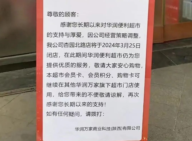 近日,華潤萬家商業(yè)科技(陜西)有限公司發(fā)布閉店公告,稱因公司經(jīng)營策略調(diào)整,華潤萬家杏園北路店將于2024年3月25日閉店。對于會員卡、會員積分、購物卡,消費(fèi)者可以繼續(xù)在其他華潤萬家旗下超市門店使用。 |