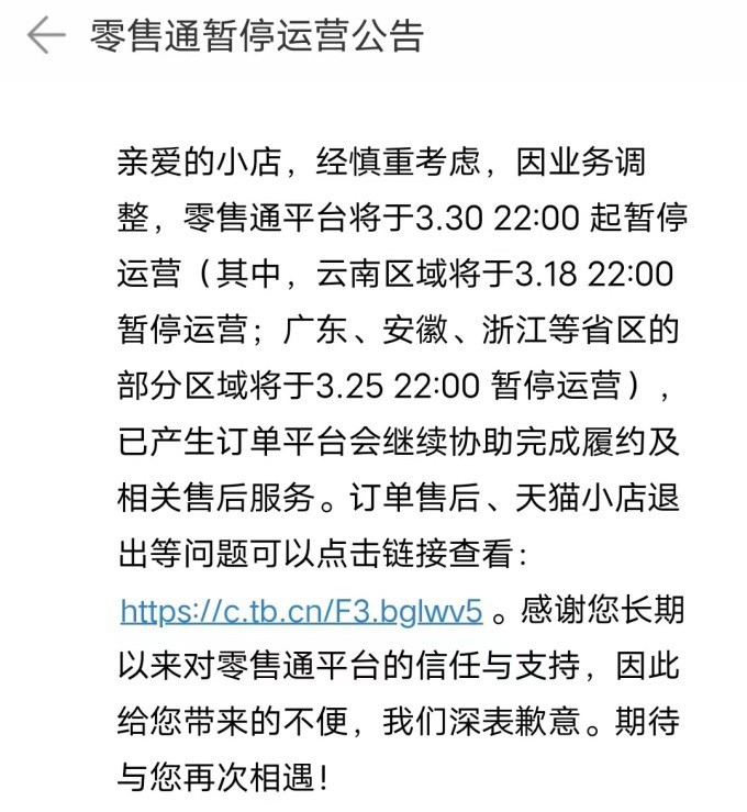 3月19日消息,日前,阿里零售通已分別向商家和天貓小店發(fā)布暫停運(yùn)營通知稱:經(jīng)慎重考慮,零售通平臺(tái)將于3.30 22:00 起暫停運(yùn)營(其中,云南區(qū)域?qū)⒂?.18 22:00暫停運(yùn)營;廣東、安徽、浙江等省區(qū)的部分區(qū)域?qū)⒂?.25 22:00 暫停運(yùn)營),已產(chǎn)生訂單需要您繼續(xù)完成履約及售后服務(wù)。因此給您帶來的不便,我們深表歉意。期待與您再次相遇! 這也意味著,從3月18日22:00開始,零售通陸續(xù)暫停運(yùn)營,3月30日22:00起正式全域暫停運(yùn)營,而天貓小店也將退出歷史舞臺(tái)。 此前有媒體發(fā)文稱,雖然阿里零售通商業(yè)模式可行,但是在實(shí)際操作中會(huì)遭遇很多難題。 比如,中國零售市場(chǎng)十分分散,小店主的經(jīng)營能力并非一致,改造的成本和回報(bào)往往也不成正比。但長期來看,小店作為零售的毛細(xì)血管,仍然具備獨(dú)特的價(jià)值,特別是在老齡化趨勢(shì)越來越明顯的當(dāng)下。 值得注意的是,目前,中國零售市場(chǎng)正從規(guī)模從規(guī)模轉(zhuǎn)向深耕與盈利。以往的高投入已經(jīng)難以換取回報(bào),以資金換取增長空間已經(jīng)行不通了。 |