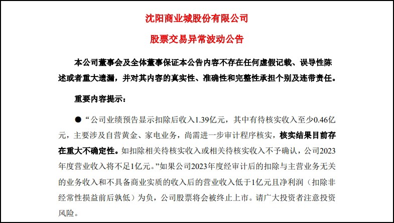 3月20日,沈陽商業(yè)城股份有限公司發(fā)布股票交易異常波動公告,披露了公司2023年度業(yè)績預告及相關業(yè)務情況。 據公告,該公司預計2023年度營業(yè)收入為1.39億元,但其中有待核實的收入至少0.46億元,主要涉及自營黃金和家電業(yè)務。若扣除待核實收入或不予確認,則2023年度營業(yè)收入將低于1億元。 同時,公告還披露了公司自營黃金業(yè)務和家電業(yè)務的具體情況。在自營黃金業(yè)務中,部分客戶消費大額、高頻或異地開戶交易,涉及金額約2522萬元。而在自營家電業(yè)務中,公司接受供應商免費倉儲、物流服務,部分商品由供應商直發(fā)客戶,涉及金額約2065萬元。這些情況也增加了公司營業(yè)收入的不確定性。 公告還提到公司近六年四次籌劃重大資產重組均未果,且近三個會計年度連續(xù)虧損,最近一年審計報告顯示持續(xù)經營能力存疑。這些情況表明,公司的財務狀況和未來發(fā)展前景都面臨較大的挑戰(zhàn)。 公司控股股東和實際控制人曾承諾注入優(yōu)質資產,但至今無進展。這一承諾的落空也進一步加劇了公司的經營困境。 |