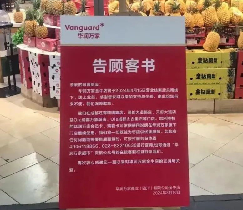 3月16日,華潤萬家商業(yè)(四川)有限公司金牛店發(fā)布了一則《告顧客書》,宣布該店將在2024年4月15日營業(yè)結束后,全面停止線下及線上業(yè)務。 目前,該公司在成都仍設有琉璃路店、驛都大道路店、天府大道店以及Ole成都萬象城店和Ole成都太古里店等門店。 |