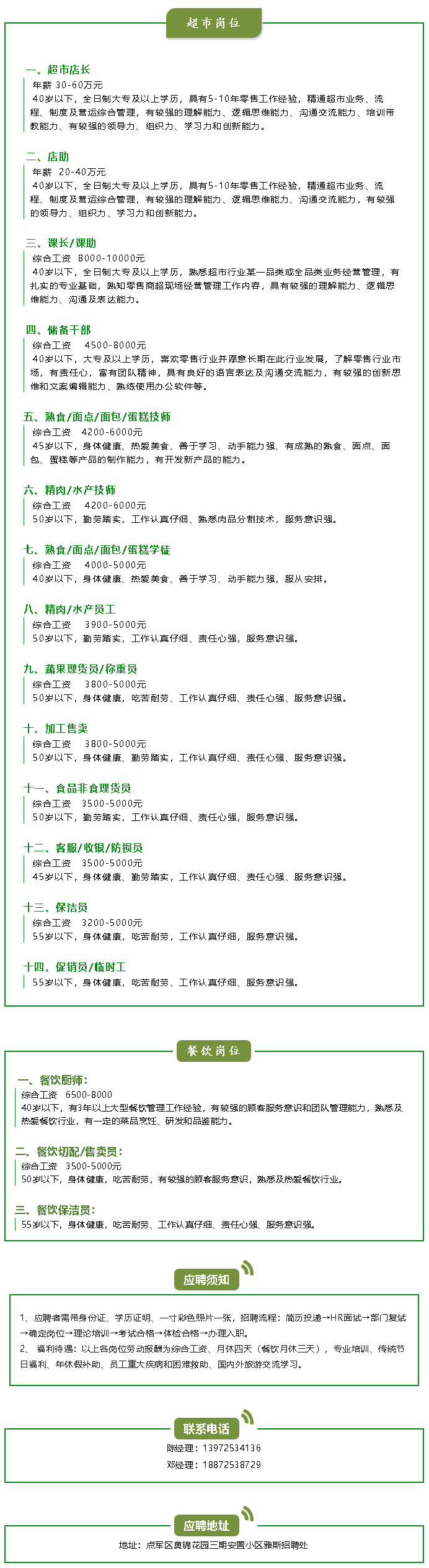 近日,被譽為“湖北的胖東來”的雅斯超市點軍奧錦花園店發(fā)布招聘信息。 招聘涉及多個崗位,包括超市店長/店助、課長/課助、儲備干部、精肉/水產(chǎn)技師/員工、熟食/面點/面包/蛋糕技師/學(xué)徒、理貨員/收銀員/防損員/客服員、促銷員/臨時工等。其中店長的年薪30-60萬元、店助20-40萬元、課長綜合工資8000-10000元。 湖北雅斯集團成立于1992年,是一家集超市、餐飲、物流、服裝、百貨、兒童、酒店、地產(chǎn)為一體的多業(yè)態(tài)公司。雅斯2005年加入國際SPAR,2015年結(jié)緣于河南胖東來,經(jīng)過胖東來董事長于東來先生的親自指導(dǎo),雅斯被譽為“湖北的胖東來”。 嚴(yán)格來說,湖北雅斯1997年成立,前身為雅斯日化超市,目前是宜昌連鎖超市龍頭之一,覆蓋宜昌、荊門等湖北20多個縣市,截止2022年9月,共有80余家連鎖店。 |