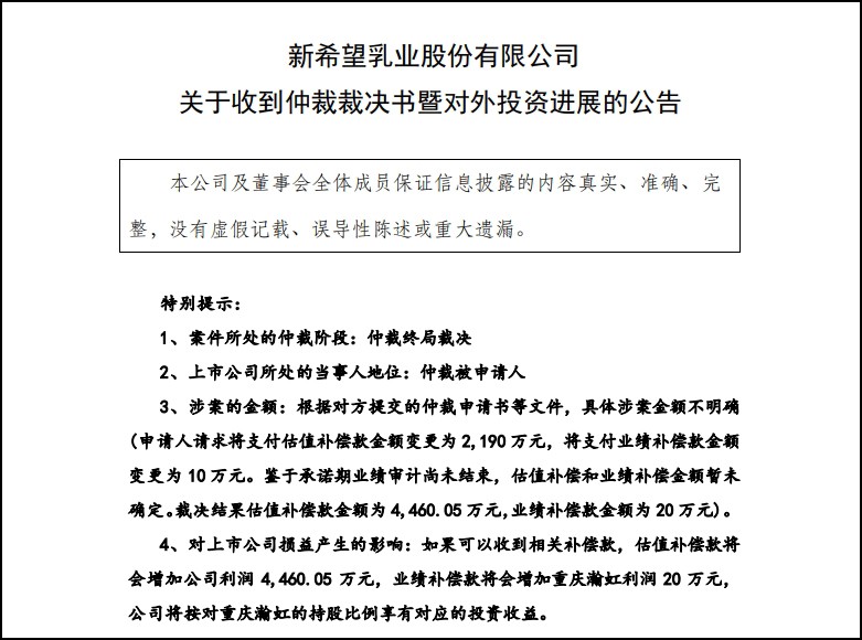 3月25日,新乳業(yè)發(fā)布公告收到重慶仲裁委員會的裁決書,對于新乳業(yè)收購重慶新牛瀚虹實業(yè)有限公司(注,即“一只酸奶牛”的運(yùn)營方,簡稱重慶瀚虹)60%股權(quán)一事,裁決新乳業(yè)應(yīng)收到的估值補(bǔ)償款變更為4460.05萬元,重慶瀚虹應(yīng)收到的業(yè)績補(bǔ)償款為20萬元。 此前,新乳業(yè)為擴(kuò)大經(jīng)營規(guī)模斥資約2.3億元收購重慶瀚虹60%的股權(quán),并簽署了估值補(bǔ)償和業(yè)績補(bǔ)償?shù)葘協(xié)議。但對賭協(xié)議的兌現(xiàn)期限未到,重慶瀚虹卻因公共衛(wèi)生事件的影響業(yè)績表現(xiàn)不佳,要求變更各類補(bǔ)償款項。 對于此次仲裁影響,新乳業(yè)方面表示,如果可以收到相關(guān)補(bǔ)償款,估值補(bǔ)償將會增加公司利潤4460.05萬元,業(yè)績補(bǔ)償款將會增加重慶瀚虹利潤20萬元,公司將按對重慶瀚虹的持股比例享有對應(yīng)的投資收益。 |