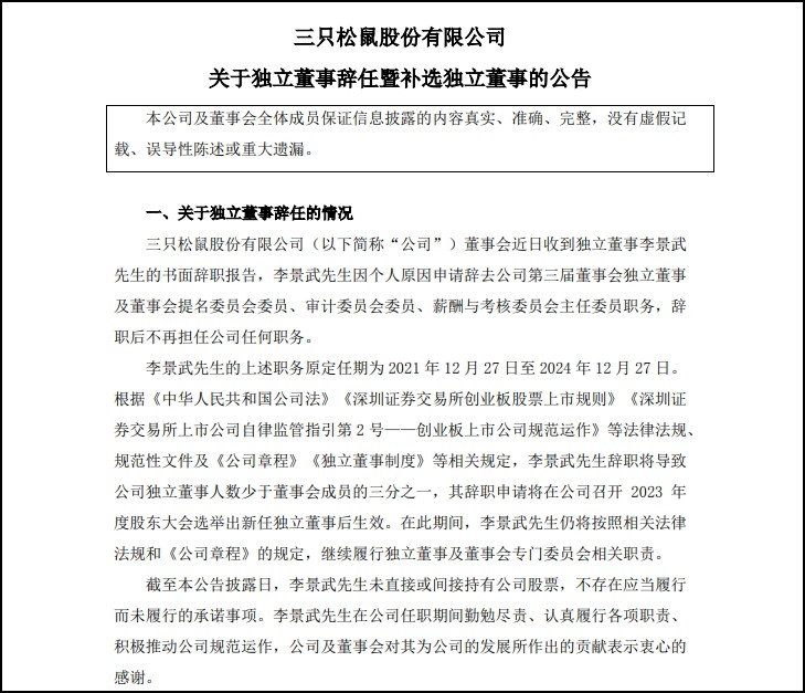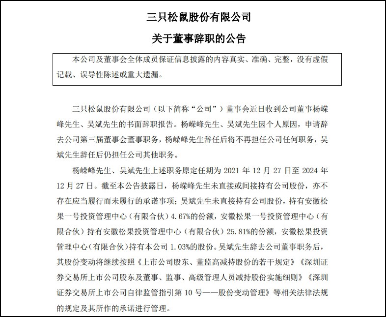 3月25日消息,三只松鼠公告稱,公司董事楊嶸峰先生、吳斌先生近日提交了書面辭職報告。 兩位董事因個人原因,申請辭去公司第三屆董事會董事職務。楊嶸峰先生辭任后將不再擔任公司任何職務,吳斌先生辭任后仍擔任公司其他職務。兩位董事的原定任期為2021年12月27日至2024年12月27日。 楊嶸峰先生未直接或間接持有公司股份,吳斌先生未直接持有公司股份,但持有安徽松果一號投資管理中心(有限合伙)4.67%的份額,該投資中心持有本公司1.03%的股份。兩位董事的辭職不會導致公司董事會成員人數低于法定最低人數,不會影響公司董事會的正常運行,亦不會影響公司的日常運營。 值得注意的是,根據三只松鼠公告,非職工代表監(jiān)事蘇軍、劉叢叢因個人原因申請辭去公司第三屆監(jiān)事會非職工代表監(jiān)事職務,蘇軍辭任后將不再擔任公司任何職務,劉叢叢辭任后仍擔任公司相關職務;獨立董事李景武因個人原因申請辭去公司第三屆董事會獨立董事及董事會提名委員會委員、審計委員會委員、薪酬與考核委員會主任委員職務,辭職后不再擔任公司任何職務。 |