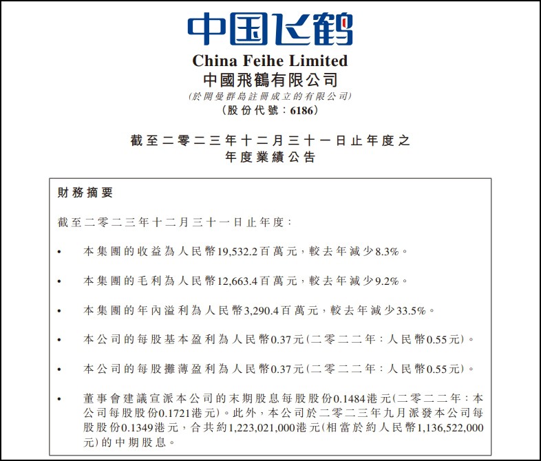 3月28日,飛鶴發(fā)布2023年業(yè)績報(bào)告。期內(nèi),收入195.322億元,同比減少8.3%;凈利潤32.9億元,同比較少33.5%。拆分來看,2023年下半年飛鶴營收環(huán)比增長0.6%,凈利潤環(huán)比增長3.2%。 據(jù)弗若斯特沙利文數(shù)據(jù),2019年-2023年,飛鶴在中國嬰幼兒配方奶粉市場(不含港澳臺地區(qū))連續(xù)五年位居第一,在全球嬰幼兒配方奶粉市場連續(xù)三年銷量第一。 市場領(lǐng)先的背后,是飛鶴以科技創(chuàng)新推動(dòng)產(chǎn)業(yè)升級的長期努力。報(bào)告期內(nèi),飛鶴研發(fā)投入6.1億元,同比增長24%,全年申請專利226件,獲授權(quán)專利130件。 截至去年底,飛鶴主要通過全國2800多名線下客戶的經(jīng)銷網(wǎng)絡(luò)銷售產(chǎn)品,覆蓋了超過83,000個(gè)零售銷售點(diǎn),線下客戶銷售所產(chǎn)生的收入占其來自乳制品總收入的79.6%。 展望未來,飛鶴表示會聚焦生命早期1000天,以此為基礎(chǔ)全力拓展孕嬰童、兒童及學(xué)生、健康食品、營養(yǎng)健康四大業(yè)務(wù)領(lǐng)域。此外,董事會議決定建議派發(fā)末期股息總計(jì)約12.209億元。 |