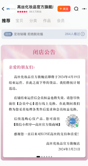 近日,天貓高絲化妝品官方旗艦店發(fā)布公告,將于2024年4月19日結(jié)束運(yùn)營(yíng)。 公開(kāi)資料顯示,高絲是日本一家以化妝品制造與販?zhǔn)蹫橹鞯钠髽I(yè),初期以代理美容化妝品牌為主,1948年開(kāi)始發(fā)展自有品牌,目前集團(tuán)旗下共擁有KOSE高絲、COSMEDECORTE黛珂等多個(gè)品牌。 從店鋪信息來(lái)看,天貓高絲化妝品官方期艦店已運(yùn)營(yíng)超過(guò)14年,累計(jì)粉絲達(dá)88.5萬(wàn),運(yùn)營(yíng)方為高絲化妝品銷售(中國(guó))有限公司,系日妝集團(tuán)高絲于中國(guó)設(shè)立的獨(dú)資公司。 除了天貓旗艦店,高絲中國(guó)官網(wǎng)關(guān)聯(lián)的高絲在線商城在2023年8月31日已經(jīng)關(guān)閉。 據(jù)高絲化妝品官方旗艦店顯示,旗艦店內(nèi)共有三大品牌產(chǎn)品在售,分別為高絲茵菲妮、高絲蘊(yùn)一以及高絲MAKE KEEP MIST品牌,店鋪SKU約38個(gè),護(hù)膚、彩妝類產(chǎn)品均有售賣(mài),產(chǎn)品單價(jià)在55-3150元不等。 此外,據(jù)青眼不完全統(tǒng)計(jì)發(fā)現(xiàn),2023年來(lái),已有至少11個(gè)日妝品牌宣布關(guān)店或倒下。 |