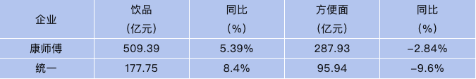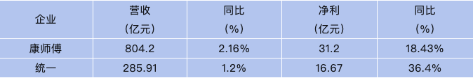 “瑜亮”爭(zhēng)鋒,康統(tǒng)爭(zhēng)霸! 自1992年進(jìn)入中國(guó)大陸市場(chǎng)以來(lái),兩家臺(tái)資食品企業(yè)統(tǒng)一和康師傅,便在大陸市場(chǎng)展開(kāi)了多年的市場(chǎng)爭(zhēng)奪戰(zhàn)。日前,這對(duì)“食業(yè)雙雄”先后發(fā)布2023年成績(jī)單,并釋放出不同的亮點(diǎn)。通過(guò)整理發(fā)現(xiàn),康統(tǒng)在2023年的表現(xiàn)有這些亮點(diǎn)區(qū)別。 01 看成績(jī) 康師傅:首破800億,連續(xù)七年增長(zhǎng) 統(tǒng)一:營(yíng)收286億,再創(chuàng)新高 從去年業(yè)績(jī)情況來(lái)看,二者均取得營(yíng)收凈利雙增。 康師傅2023年?duì)I收804.2億元,同比增2.16%;凈利31.2億元,同比增長(zhǎng)18.43%。據(jù)悉,這是康師傅交出的第七年連續(xù)增長(zhǎng)的成績(jī)單。 統(tǒng)一2023年表現(xiàn)同樣不俗,營(yíng)收285.913億元,同比增1.2%,再創(chuàng)新高;凈利潤(rùn)16.671億元,同比增36.4%。 對(duì)此,統(tǒng)一在財(cái)報(bào)中提到,本集團(tuán)在疫情期間展出無(wú)比韌性,靠著經(jīng)驗(yàn)豐富的經(jīng)營(yíng)團(tuán)隊(duì)、穩(wěn)健的獲利模式與風(fēng)險(xiǎn)控管機(jī)制,不斷優(yōu)化組織營(yíng)運(yùn)結(jié)構(gòu),妥善因應(yīng)市場(chǎng)變動(dòng)所帶來(lái)的系統(tǒng)性風(fēng)險(xiǎn);自2020年疫情爆發(fā)以來(lái),統(tǒng)一集團(tuán)收益年復(fù)合增長(zhǎng)率達(dá)7.9%,其中飲品年收益復(fù)合增長(zhǎng)率更是達(dá)12.3%。 02 看品類 同命相連——面品同降、飲品雙雙大增 如今,康統(tǒng)雙雄在在品類上形成全方位對(duì)壘,兩者的競(jìng)爭(zhēng)充滿著殘酷。從去年財(cái)報(bào)來(lái)看,康統(tǒng)“同命相連”——面品同降、飲品則雙雙迎來(lái)大增。下面具體來(lái)看: 飲品板塊: 財(cái)報(bào)顯示,去年統(tǒng)一飲品板塊營(yíng)收177.755億元,同比增長(zhǎng)8.4%。其中,統(tǒng)一茶飲料營(yíng)收75.795億元,同比增長(zhǎng)9%;果汁營(yíng)收34.042億元,同比增長(zhǎng)13.3%,創(chuàng)7年歷史新高;奶茶品類營(yíng)收63.052億元,同比增長(zhǎng)5.0%。 再看康師傅,2023年各細(xì)分板塊同樣全部飄紅,實(shí)現(xiàn)營(yíng)收凈利雙雙正增長(zhǎng)。財(cái)報(bào)顯示,康師傅飲品事業(yè)整體收益為509.39億元,同比增長(zhǎng)5.39%,占集團(tuán)總收益63.34%。茶飲料產(chǎn)品收益200.59億元,同比增長(zhǎng)6.96%;水產(chǎn)品收益53.75億元,同比增長(zhǎng)9.78%;果汁產(chǎn)品收益71.5億元,同比增長(zhǎng)4.47%;碳酸及其他產(chǎn)品合計(jì)收益183.55億元。 值得注意的是,過(guò)去茶飲料曾經(jīng)是康統(tǒng)的天下,這兩年在農(nóng)夫山泉旗下茶π和東方樹(shù)葉的先后爆發(fā)下,現(xiàn)在這一格局已被徹底改寫(xiě)。2023年,康師傅茶飲料收入200.59億元,統(tǒng)一中控茶飲料收入75.8億元,農(nóng)夫山泉茶飲料實(shí)現(xiàn)收入126.59億元,同比大增83.3%,已經(jīng)穩(wěn)居第二位置。 方便面板塊: 飲品板塊康統(tǒng)雙雙增長(zhǎng),但方便面業(yè)務(wù)卻均出現(xiàn)不同幅度的下滑。 統(tǒng)一食品業(yè)務(wù)2023年?duì)I收98.468億元,較2022年下滑約10%。其中,方便面營(yíng)收95.943億元,2022年同期為106.196億元,同比下滑約9.6%。以此數(shù)據(jù)測(cè)算,其它食品(含自熱食品、冷鮮面、休閑食品等)營(yíng)收約2.5億元,開(kāi)小灶發(fā)展前景仍值得期待。 康師傅2023年方便面板塊營(yíng)業(yè)額為287.93億元,同比下降2.84%,集團(tuán)總營(yíng)業(yè)額占比由2022年的37.65%下滑1.85%至35.80%。不過(guò)財(cái)報(bào)中指出,盡管營(yíng)收下降,但由于原材料價(jià)格下降及售價(jià)有利,康師傅方便面毛利率同比提高3.05%至27.00%。由于毛利率同比提高帶動(dòng),方便面事業(yè)2023年全年的公司股東應(yīng)占溢利同比提高46.10%至20.08億元。 03 看產(chǎn)品 統(tǒng)一:阿薩姆破60億,茄皇表現(xiàn)出眾 康師傅:無(wú)糖茶產(chǎn)品全面煥新 統(tǒng)一在財(cái)報(bào)中對(duì)茄皇、開(kāi)小灶、統(tǒng)一綠茶、海之言、阿薩姆奶茶等明星產(chǎn)品進(jìn)行重點(diǎn)表?yè)P(yáng): 「茄皇」持續(xù)獲得市場(chǎng)青睞,近三年的收益年復(fù)合增長(zhǎng)率呈翻倍成長(zhǎng); 「開(kāi)小灶」持續(xù)發(fā)揚(yáng)中華美食文化,推出「私房菜」系列新品,積極拓展產(chǎn)品矩陣; 「統(tǒng)一綠茶」堅(jiān)持創(chuàng)新和優(yōu)化產(chǎn)品力,積累品牌資產(chǎn),打造國(guó)民健康好茶品牌; 「海之言」抓住后疫情時(shí)代新的消費(fèi)機(jī)遇,收益同比呈高雙位數(shù)增長(zhǎng),2023年收益增長(zhǎng)率及過(guò)去三年收益年復(fù)合增長(zhǎng)率均呈高雙位數(shù)成長(zhǎng); 「統(tǒng)一阿薩姆奶茶」進(jìn)一步拓展飲用場(chǎng)景,穩(wěn)居行業(yè)領(lǐng)導(dǎo)地位。從數(shù)據(jù)來(lái)看,奶茶板塊全年?duì)I收63.052億元,同比增長(zhǎng)5.0%。其中「阿薩姆奶茶」單品營(yíng)收破60億元,持續(xù)位居市場(chǎng)頭部地位。 相對(duì)于統(tǒng)一,康師傅此次亮點(diǎn)的產(chǎn)品頗具差異化: 康師傅“無(wú)糖冰紅茶”口味和包裝都迎來(lái)了全面升級(jí),以進(jìn)一步契合健康消費(fèi)趨勢(shì)。 康師傅“綠茶”也對(duì)包裝和品牌形象進(jìn)行煥新,并攜手新代言人吳磊發(fā)布新品“無(wú)糖茉莉綠茶”,強(qiáng)化