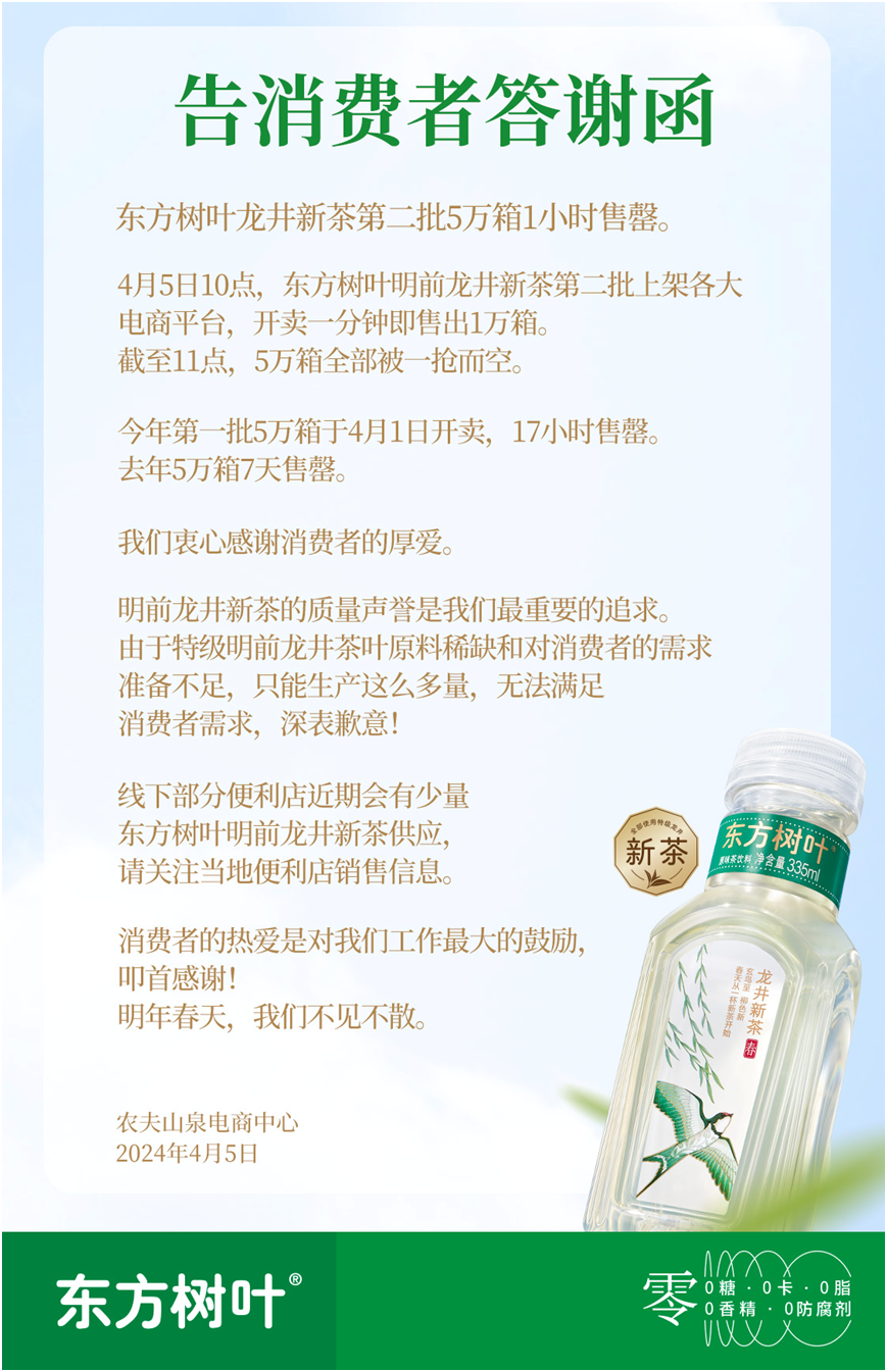 消費(fèi)者熱情空前高漲,要求加量再生產(chǎn)。 再破紀(jì)錄!4月5日上午10點(diǎn),東方樹葉第二批5萬箱龍井新茶在各大電商平臺上線,開賣1分鐘便售出1萬箱,1小時(shí)全部售罄。打破4月1日第一批5萬箱17小時(shí)售罄的記錄。東方樹葉也霸榜了各大電商平臺的銷售榜。消費(fèi)者熱情空前高漲,紛紛要求再加量生產(chǎn)。 據(jù)悉,第二批龍井新茶原料依舊于清明前采摘制作,并于4月4日、5日生產(chǎn),6 號開始發(fā)貨。 在某電商平臺上,有消費(fèi)者給出“茶湯清透”、“豆香濃郁”、“香氣很足”等評價(jià),來凸顯東方樹葉龍井新茶的鮮嫩干爽口感。 自2022年首次上市以來,東方樹葉龍井新茶的熱度一年超過一年。 對龍井茶來說,時(shí)間決定了茶葉的色香味。明前茶珍貴而稀少,自古以來鮮嫩就是喝龍井的追求。東方樹葉通過科技創(chuàng)新,充分保留和展現(xiàn)了明前龍井綠茶特有的嫩香、淺綠色的茶湯和鮮純甘爽的口感,與現(xiàn)泡明前茶已經(jīng)非常接近。 農(nóng)夫山泉表示,希望用科技創(chuàng)新的力量,去復(fù)現(xiàn)老祖宗對茶葉的理解和智慧,為中國消費(fèi)者,為世界的消費(fèi)者,提供現(xiàn)代的中國茶。 至于今年春天還會(huì)不會(huì)有線上第三批?東方樹葉在發(fā)布的“告消費(fèi)者答謝函”中稱:“明前龍井新茶的質(zhì)量聲譽(yù)是我們最重要的追求。由于特級明前龍井茶葉原料稀缺和對消費(fèi)者的需求準(zhǔn)備不足,只能生產(chǎn)這么多量,無法滿足消費(fèi)者需求,深表歉意!” 另據(jù)了解,線下部分便利店近期會(huì)有少量東方樹葉明前龍井新茶供應(yīng)。 |