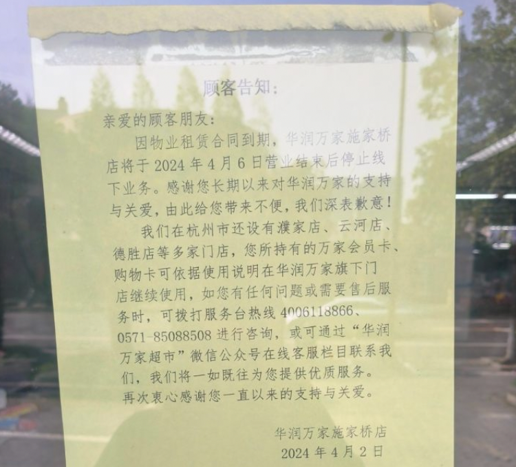 近日,有網(wǎng)友報(bào)料,位于杭州朝暉路的華潤萬家施家橋店突然關(guān)門。 目前,該店大門已經(jīng)緊閉,門上貼著一張黃色的“顧客告知”,透過玻璃門可以看到,超市內(nèi)的貨品基本全部搬空,剩下少許貨架,有工人正忙著拆除室內(nèi)的裝修。 告知顯示,因物業(yè)租賃合同到期,華潤萬家施家橋店于4月6日營業(yè)結(jié)束后停止線下業(yè)務(wù)。 據(jù)悉,華潤萬家施家橋店于2006年開業(yè),已經(jīng)運(yùn)營18年。 有華潤萬家的工作人員表示,施家橋店前兩天因租賃合同到期已正式關(guān)停,同時關(guān)閉了線上線下業(yè)務(wù)。 盡管該店已關(guān)閉,但售后需求還會有延長期。截至到4月13日,超市會繼續(xù)安排工作人員在門店門口提供商品退換貨、會員積分兌換等服務(wù),服務(wù)時間每天8:30-17:00。此外,消費(fèi)者手里持有的會員卡、購物卡等,還可以在杭州其他門店繼續(xù)使用。 該店關(guān)閉后,華潤萬家旗下的大賣場在杭州還有9家門店,距離朝暉路施家橋比較近的是云河店、德勝店等。 |