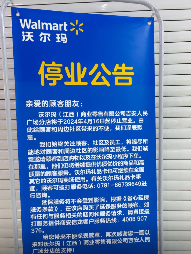 4月9日,沃爾瑪吉安人民廣場店發(fā)布公告,宣布將于2024年4月16日起停止?fàn)I業(yè)。 公告內(nèi)容顯示,為了將對顧客和周邊社區(qū)的影響降至最低,該店誠意邀請顧客到店購物以及在沃爾瑪小程序下單,仍將繼續(xù)提供優(yōu)質(zhì)優(yōu)價的商品和高質(zhì)量的顧客服務(wù)。 在超市門口的另一處,沃爾瑪吉安人民廣場分店還貼出了對供應(yīng)商伙伴的公告表示,吉安人民廣場分店的停業(yè)不會影響沃爾瑪與供應(yīng)商的良好合作,沃爾瑪仍將在全國門店與本土供應(yīng)商開展良好合作。此外,商場也貼出溫馨提示,處理退卡等事宜。 資料顯示,沃爾瑪吉安人民廣場店于2013年開業(yè),至今已有11年,其關(guān)閉的消息讓許多顧客和網(wǎng)友感到惋惜。 2023年以來,沃爾瑪在中國陸續(xù)關(guān)閉了北京、南京、寧波、長春、西安等多家門店。近期,沃爾瑪在其他城市也有閉店情況,其中,沃爾瑪荊州北京中路店、沃爾瑪南京首店于2月停業(yè),鷹潭沃爾瑪超市于3月5日停業(yè)。關(guān)停門店的原因也多為“租約到期,不再續(xù)約”。 |