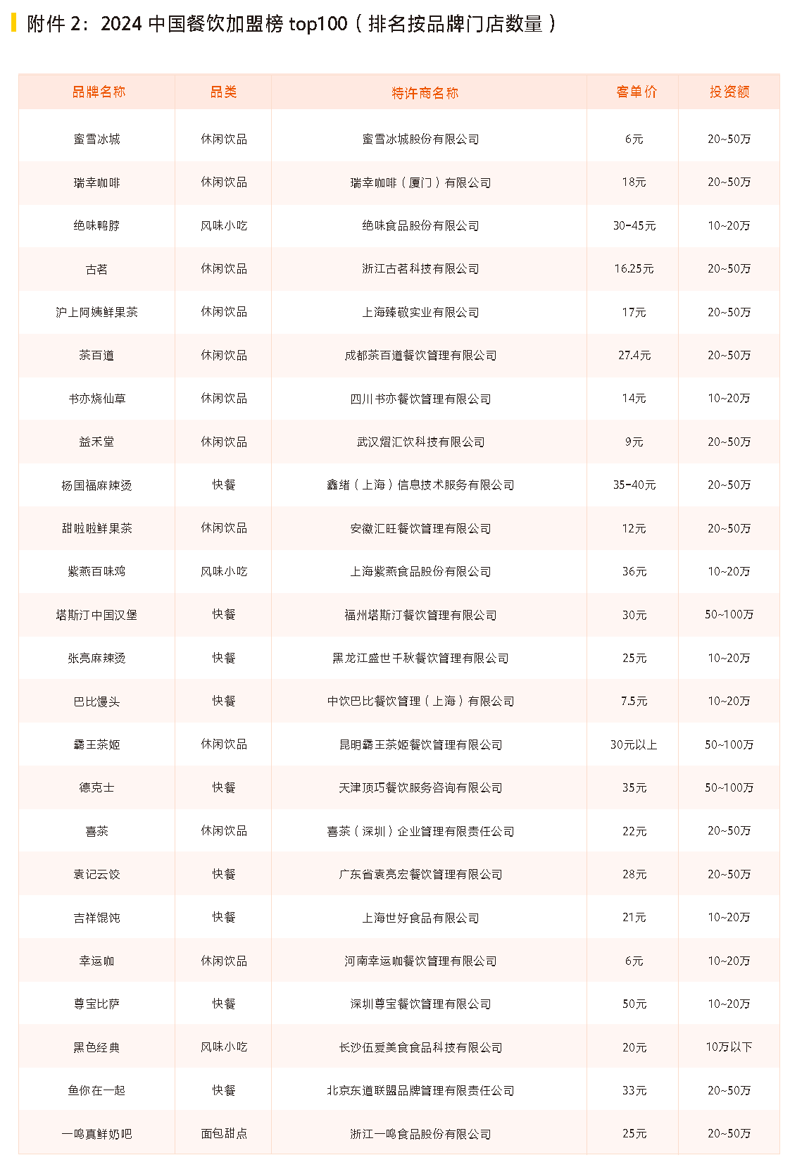 4月8日,中國連鎖經(jīng)營協(xié)會(簡稱CCFA)聯(lián)合美團于上海正式發(fā)布“2024中國餐飲加盟品牌TOP100”(下稱“餐飲加盟TOP100”),榜單覆蓋小吃快餐、休閑飲品、火鍋燒烤等六大餐飲品類。 既有蜜雪冰城、楊國福和魚你在一起等8家品牌連續(xù)6年入選,也有喜茶、朱光玉和虎丫炒雞等21家加盟品牌首次入選,較去年增長超30%。 2024年“餐飲加盟TOP100”在經(jīng)營消費大數(shù)據(jù)的基礎(chǔ)上,從品牌成長力、加盟門店經(jīng)營狀況、消費者認可度三大維度對餐飲加盟品牌進行客觀、公正、綜合評估。從地域分布看,上海本地上榜的品牌數(shù)已連續(xù)五年領(lǐng)跑全國,美食之都成都位居第二。 近年,喜茶、奈雪的茶、老鄉(xiāng)雞和樂凱撒等品牌紛紛選擇成本低、運營更靈活的加盟模式,搶占市場。餐飲加盟TOP100中,加盟門店超過6000家的品牌數(shù)較去年增長了71%左右。截至2023年底,中國餐飲萬店連鎖品牌已由4家增至6家,越來越多的品牌通過“堂食大店+品牌衛(wèi)星店”的組合來進行規(guī);瘮U張。 |
