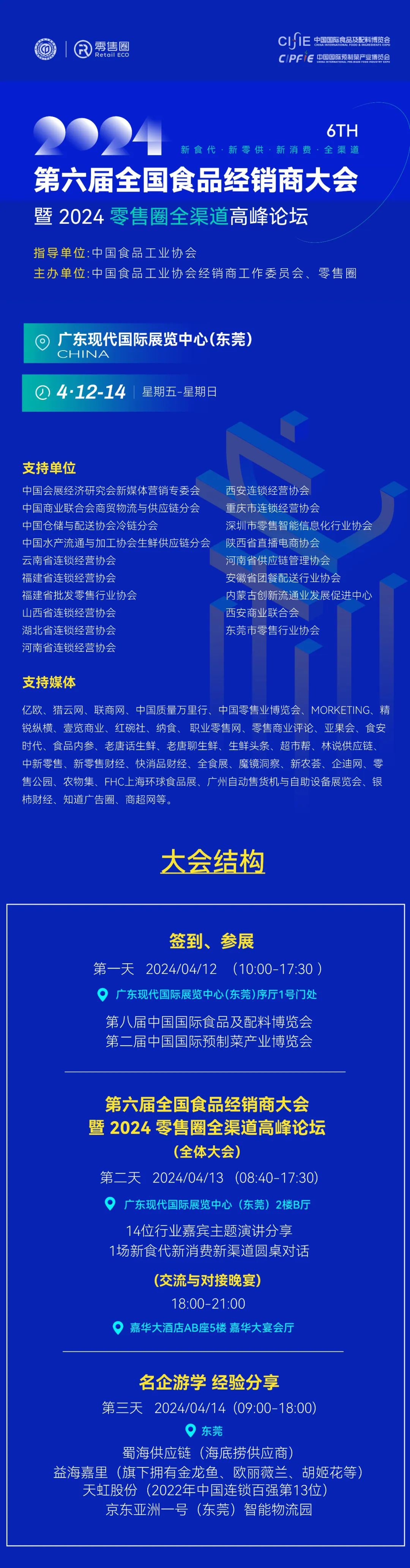 “第六屆全國食品經(jīng)銷商大會暨2024零售圈全渠道高峰論壇”將于2024年4月12日-14日在中國廣東現(xiàn)代國際展覽中心舉辦。本次大會將包含20+行業(yè)大咖對話、1天深度名企游學(xué)、1000+零售人聚會、2000萬+媒體曝光! 大會亮點 8萬方食品和預(yù)制菜展覽 3萬+食品與零售觀眾 1000+優(yōu)質(zhì)全渠道零售商 10萬+B2B產(chǎn)銷直播 20+零售連鎖類協(xié)會支持 50+零售垂直媒體曝光 產(chǎn)/供/銷現(xiàn)場對接專區(qū) 人/貨/場對接晚宴 多個零售名企游學(xué) 20+行業(yè)大咖傳道授業(yè) |
