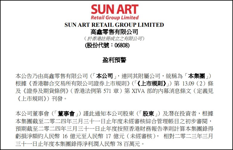 4月12日,高鑫零售發(fā)布盈利預(yù)警。集團(tuán)披露截至2024年3月31日止年度未經(jīng)審核管理賬目,預(yù)計(jì)按照香港財(cái)務(wù)報(bào)告準(zhǔn)則計(jì)算本集團(tuán)虧損凈額約人民幣16億元至17億元。相比較2022年(截至2023年3月31日)凈利潤(rùn)為7800萬元來看,同比下降2151.28%至2279.49%。 高鑫零售對(duì)此表示,預(yù)期凈虧損主要?dú)w因截至2024年3月31日止年度記取的減值損失,主要由于負(fù)現(xiàn)金流門店和關(guān)閉門店及擬關(guān)閉門店的使用權(quán)資產(chǎn)及固定資產(chǎn)減值、商譽(yù)減值等。 若不考慮減值損失影響,則預(yù)計(jì)虧損人民幣6億元至人民幣7億元。綜合原因包括業(yè)務(wù)調(diào)整以及顧客囤貨心智消失導(dǎo)致客單價(jià)減少,最終造成收入預(yù)期下降。 公告提到,集團(tuán)仍將繼續(xù)聚焦核心業(yè)務(wù),關(guān)閉長(zhǎng)期虧損門店,考慮出售不良資產(chǎn),以減少虧損及關(guān)店損失。同時(shí)在長(zhǎng)三角,珠三角,山東半島優(yōu)勢(shì)區(qū)域密集布局。 此外,高鑫零售在人事方面也有所調(diào)整,今年3月26日晚間,公司宣布任命沈輝為執(zhí)行董事兼CEO,而林小海則離開CEO崗位返回阿里巴巴集團(tuán)擔(dān)任新職務(wù)。 目前,高鑫零售旗下?lián)碛写鬂?rùn)發(fā)、大潤(rùn)發(fā)Super和M會(huì)員商店三大主力品牌,門店數(shù)量超過500家,遍布全國29個(gè)省市自治區(qū)的230多個(gè)城市。同時(shí),其線上平臺(tái)大潤(rùn)發(fā)優(yōu)鮮等吸引了超過7000萬用戶。面對(duì)市場(chǎng)變化,高鑫零售將繼續(xù)優(yōu)化業(yè)務(wù)結(jié)構(gòu),提升運(yùn)營(yíng)效率,以應(yīng)對(duì)挑戰(zhàn)并尋求新的發(fā)展機(jī)遇。 |