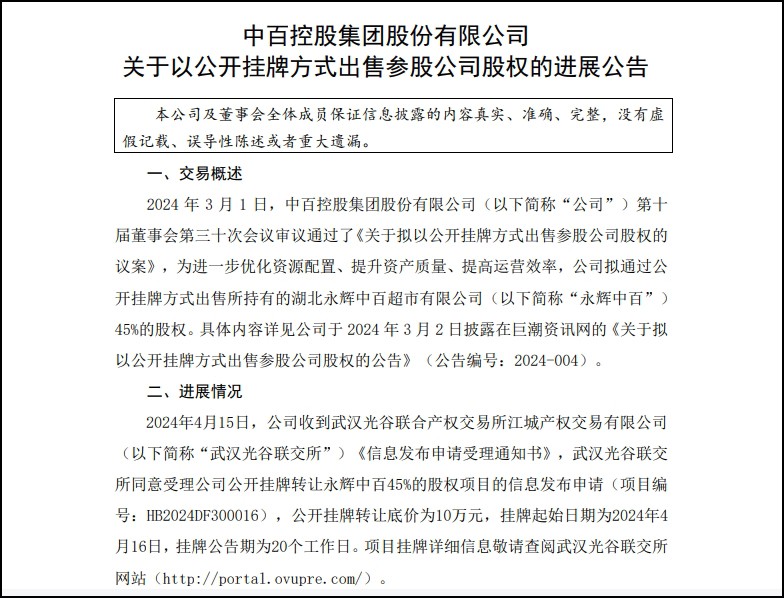 4月15日,中百控股集團股份有限公司發(fā)布關(guān)于公開掛牌出售參股公司股權(quán)的進展公告。 公告顯示,中百集團已于2024年3月1日召開第十屆董事會第三十次會議,會議通過出售湖北永輝中百超市有限公司45%股權(quán)的議案,旨在優(yōu)化資源配置、提升資產(chǎn)質(zhì)量、提高運營效率。 根據(jù)公告,4月15日,中百集團到武漢光谷聯(lián)合產(chǎn)權(quán)交易所江城產(chǎn)權(quán)交易有限公司《信息發(fā)布申請受理通知書》,武漢光谷聯(lián)交所同意受理公司公開掛牌轉(zhuǎn)讓永輝中百45%的股權(quán)項目的信息發(fā)布申請(項目編號:HB2024DF300016),公開掛牌轉(zhuǎn)讓底價為10萬元,掛牌起始日期為2024年4月16日,掛牌公告期為20個工作日。 永輝中百成立于2017年,注冊資金1億元,其中,永輝超市出資5500萬元,占合資公司注冊資本的55%;中百集團出資4500萬元,占合資公司注冊資本的45%。 合資公司的主營業(yè)務(wù)為開設(shè)超市,負責(zé)永輝超市在湖北的拓展。合資公司成立后,大本營在福建的永輝超市開始在湖北加速展店,陸續(xù)在襄陽、咸寧、黃岡、隨州等地級市開出首店。2020年12月11日,永輝超市武漢首店開業(yè)。 公告稱,受宏觀經(jīng)濟及市場環(huán)境影響,永輝中百自2019年以來連年虧損,未達設(shè)立預(yù)期。為進一步優(yōu)化資源配置、提升資產(chǎn)質(zhì)量、提高運營效率,公司擬通過公開掛牌方式出售所持有的永輝中百45%的股權(quán)。 經(jīng)營數(shù)據(jù)顯示,2022年至2023年上半年,永輝中百營業(yè)收入分別為10.13億元、5.08億元;凈利潤分別虧損7167.38萬元、1949.12萬元。截至2023年6月30日,永輝超市在湖北的門店數(shù)量為16家,永輝中百資產(chǎn)總額為7.91億元,負債總額為8.94億元,凈資產(chǎn)賬面價值為-1.02億元。 本次交易完成后,公司將不再持有永輝中百股權(quán)。 |