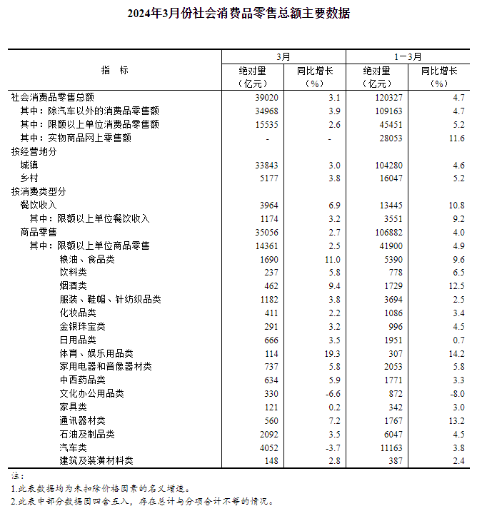 4月16日,據(jù)國家統(tǒng)計局網(wǎng)站消息,3月份,社會消費品零售總額39020億元,同比增長3.1%。其中,除汽車以外的消費品零售額34968億元,增長3.9%。 1-3月份,社會消費品零售總額120327億元,同比增長4.7%。其中,除汽車以外的消費品零售額109163億元,增長4.7%。 按經(jīng)營單位所在地分,3月份,城鎮(zhèn)消費品零售額33843億元,同比增長3.0%;鄉(xiāng)村消費品零售額5177億元,增長3.8%。1-3月份,城鎮(zhèn)消費品零售額104280億元,增長4.6%;鄉(xiāng)村消費品零售額16047億元,增長5.2%。 按消費類型分,3月份,商品零售35056億元,同比增長2.7%;餐飲收入3964億元,增長6.9%。1-3月份,商品零售106882億元,增長4.0%;餐飲收入13445億元,增長10.8%。 1-3月份,全國網(wǎng)上零售額33082億元,同比增長12.4%。其中,實物商品網(wǎng)上零售額28053億元,增長11.6%,占社會消費品零售總額的比重為23.3%;在實物商品網(wǎng)上零售額中,吃類、穿類、用類商品分別增長21.1%、12.1%、9.7%。 |
