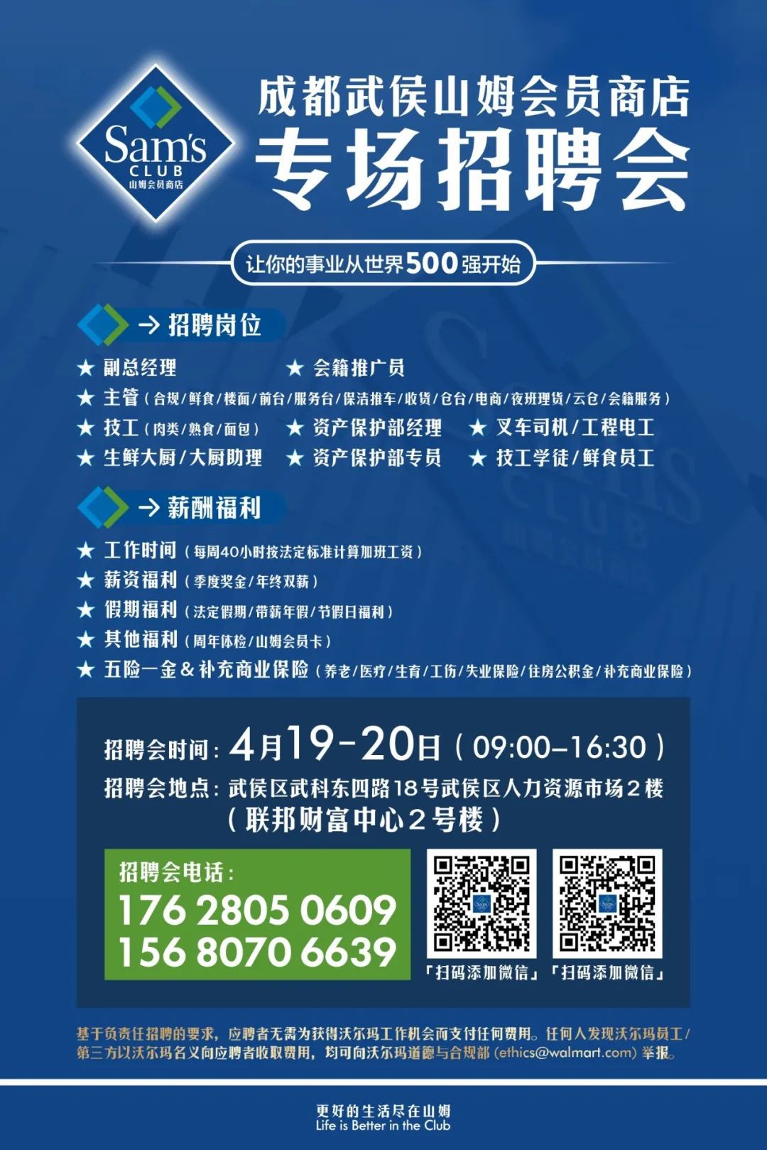 4月16日消息,“沃爾瑪招聘”官方公眾號發(fā)布一則關(guān)于成都武侯山姆新店專場招聘會的消息。 招聘的崗位涵蓋了副總經(jīng)理、鮮食/樓面/收貨/電商/云倉等主管、面包/熟食/肉類技工、資產(chǎn)保護(hù)部經(jīng)理/專員、生鮮大廚/大廚助理等多個(gè)職位。 對于薪酬福利,公司按照法定標(biāo)準(zhǔn)支付加班工資,并提供季度獎(jiǎng)金和年終雙薪。員工還可以享受到法定假期、帶薪年假和節(jié)假日福利等假期福利。招聘會將于4月19日至20日舉行,地點(diǎn)位于成都武侯區(qū)武科東四路18號武侯區(qū)人力資源市場2樓。 |