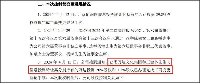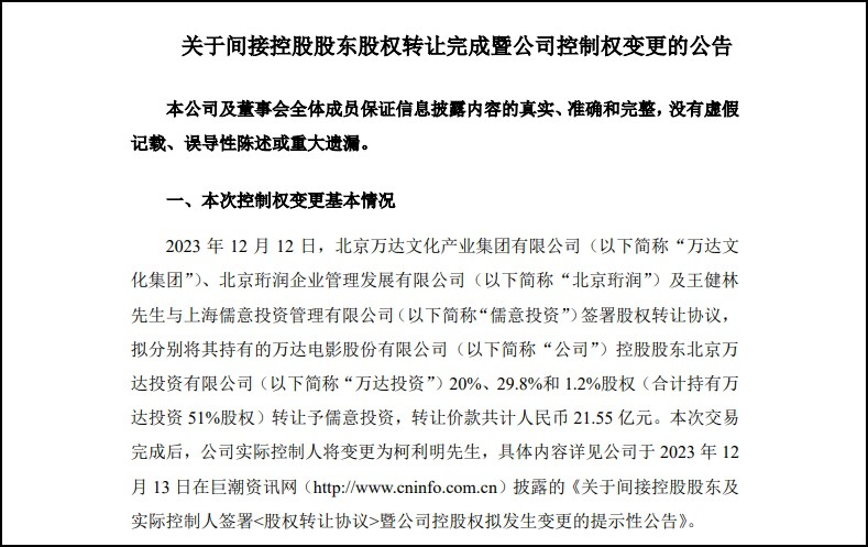 4月17日消息,萬達電影4月16日公告稱,北京萬達文化產(chǎn)業(yè)集團有限公司(簡稱“萬達文化集團”)、王健林,分別轉(zhuǎn)讓所持北京萬達投資有限公司(簡稱“萬達投資”)20%股權、1.2%股權,已辦理完成工商變更登記手續(xù)。 上述股份的受讓方為上海儒意投資管理有限公司(簡稱“儒意投資”)。加上此前受讓的股份,“儒意系”持有萬達投資100%的股份。 由于萬達投資是萬達電影的控股股東,“儒意系”借此間接控股了萬達電影!叭逡庀怠睂嵖厝丝吕魍ㄟ^上述方式,取代王健林成為萬達電影實控人。 記者注意到,“儒意系”掌控了港股公司中國儒意,背后股東包括騰訊控股。 早在2023年7月,中國儒意旗下上海儒意影視制作有限公司(簡稱“上海儒意”)與萬達文化集團訂立股權轉(zhuǎn)讓協(xié)議,約定上海儒意出資22.62億元,受讓萬達文化集團所持萬達投資49%的股權。隨后在同年12月,萬達文化集團、北京珩潤企業(yè)管理發(fā)展有限公司(簡稱“北京珩潤”)、王健林與儒意投資簽署股權轉(zhuǎn)讓協(xié)議,擬分別將所持萬達投資20%、29.8%和1.2%股權,轉(zhuǎn)讓給儒意投資,轉(zhuǎn)讓價款共計21.55億元。 至2024年1月,北京珩潤向儒意投資轉(zhuǎn)讓其持有的萬達投資29.8%股權,辦理完成工商變更登記手續(xù)。如今,萬達文化集團和王健林也完成了最后的股權轉(zhuǎn)讓,萬達投資100%的股權已全部落入“儒意系”手中。 此前,萬達系除了轉(zhuǎn)讓股權給“儒意系”,還多次轉(zhuǎn)讓萬達電影股份給其他方。 2023年7月10日,萬達投資與陸麗麗簽署股份轉(zhuǎn)讓協(xié)議,擬向陸麗麗轉(zhuǎn)讓所持萬達電影1.8億股股份,占公司總股本的8.26%,轉(zhuǎn)讓價格約21.73億元。 2023年7月18日,萬達投資擬向莘縣融智興業(yè)管理咨詢中心(有限合伙)(簡稱“莘縣融智”)轉(zhuǎn)讓所持萬達電影無限售條件流通股1.77億股,占公司總股本的8.14%,轉(zhuǎn)讓價格約23.36億元。 |