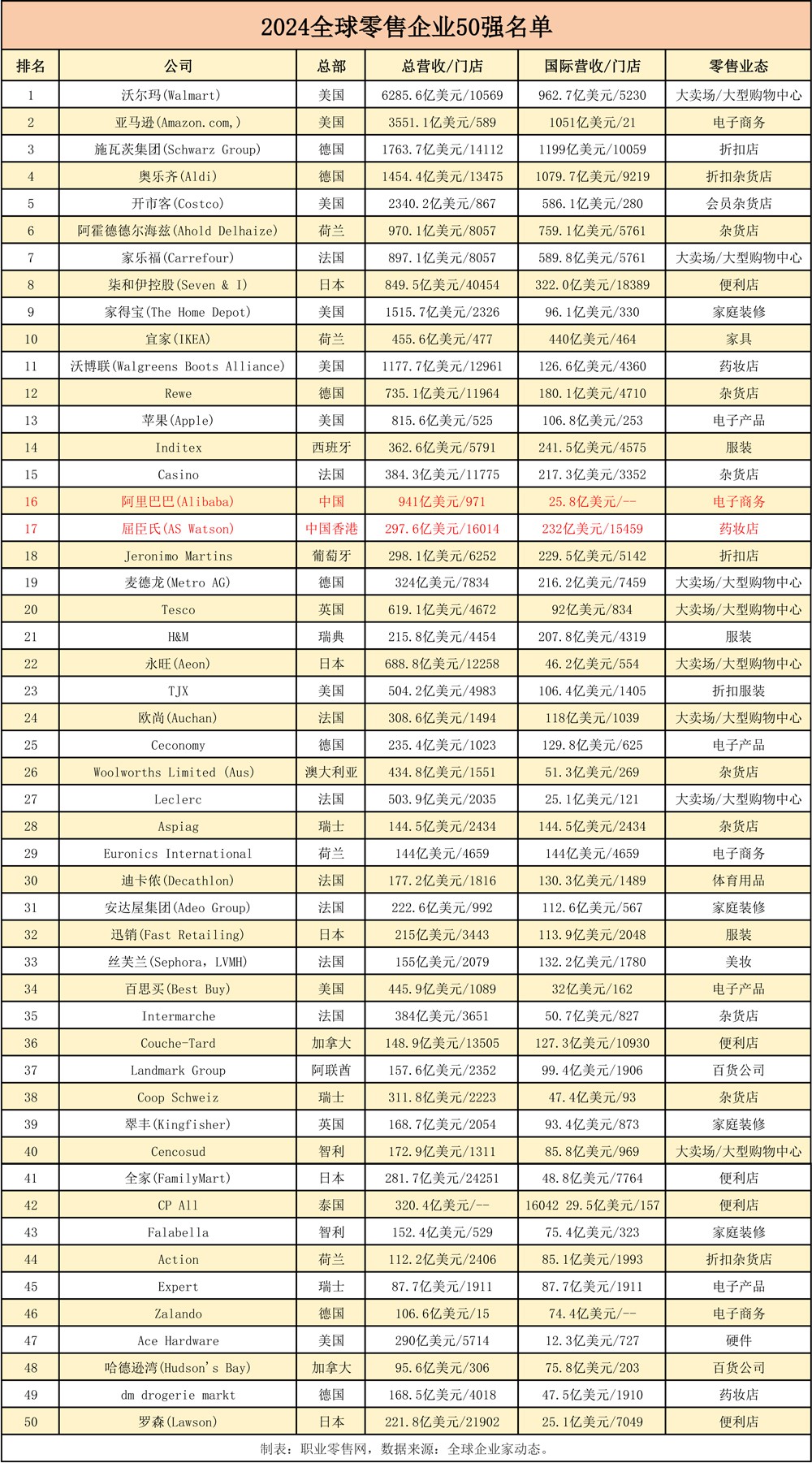 近日,美國零售聯(lián)合會(NRF,National Retail Federation)發(fā)布2024年度“全球零售50強”榜(NRF Top 50 Global Retailers 2024),沃爾瑪、亞馬遜、施瓦茨集團名列前三位,阿里巴巴和屈臣氏上榜。 據(jù)了解,榜單根據(jù)零售商的國內和國際零售收入計算分數(shù)進行排名,上榜的公司要在至少三個國家和地區(qū)進行直接投資。 |