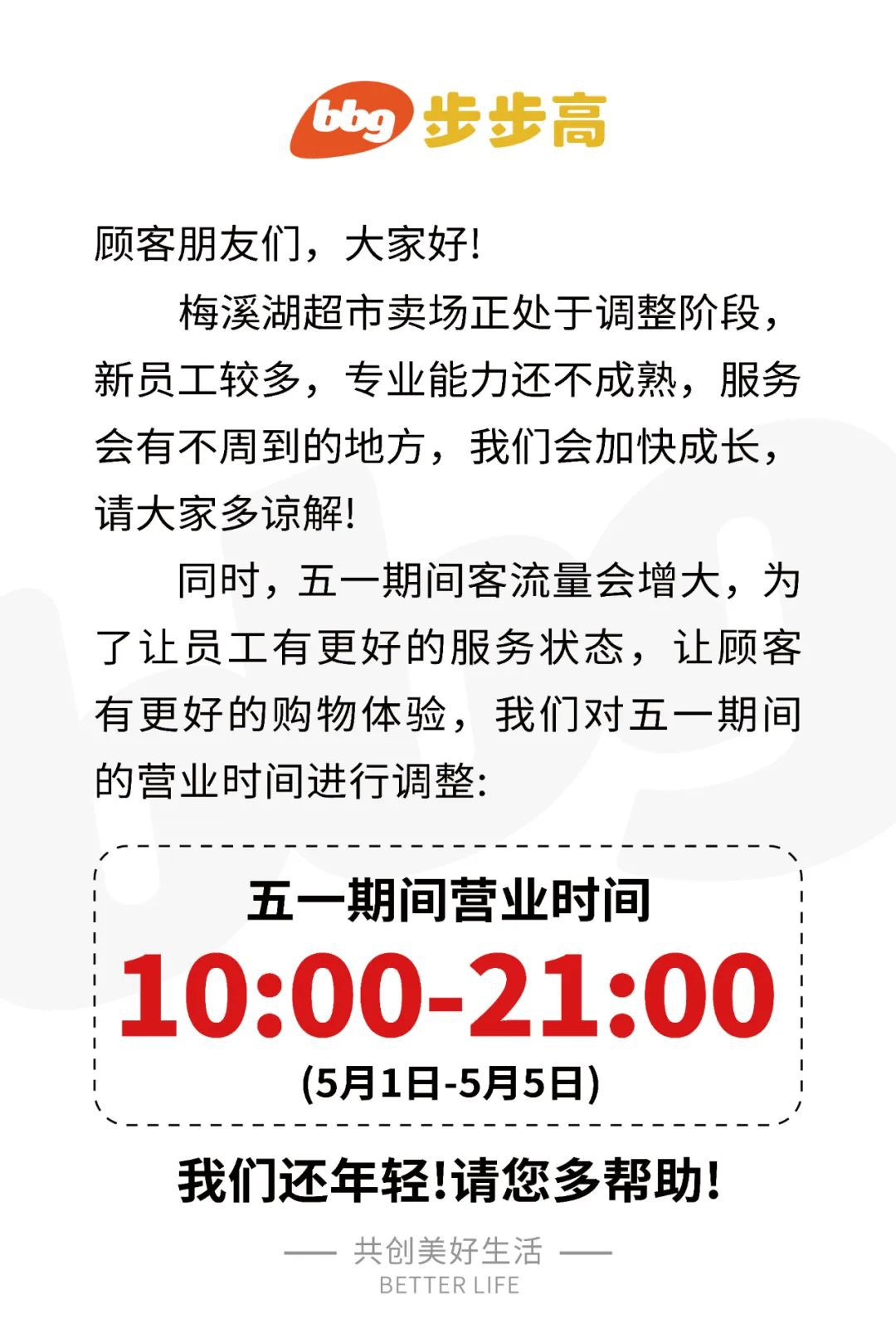 經(jīng)過胖東來“爆改”后,4月29日,步步高梅溪湖店發(fā)布五一期間營業(yè)時(shí)間調(diào)整通知。 通知稱,梅溪湖超市賣場正處于調(diào)整階段,新員工較多,主業(yè)能力還不成熟,服務(wù)會(huì)有不周到的地方,我們會(huì)加快成長,請(qǐng)大家多諒解。 同時(shí),五一期間客流量會(huì)增大,為了讓員工更好的服務(wù)狀態(tài),讓顧客有更好的購物體驗(yàn),我們決定調(diào)整營業(yè)時(shí)間為:從5月1日至5月5日,營業(yè)時(shí)間為上午10點(diǎn)至晚上21點(diǎn)。 |
