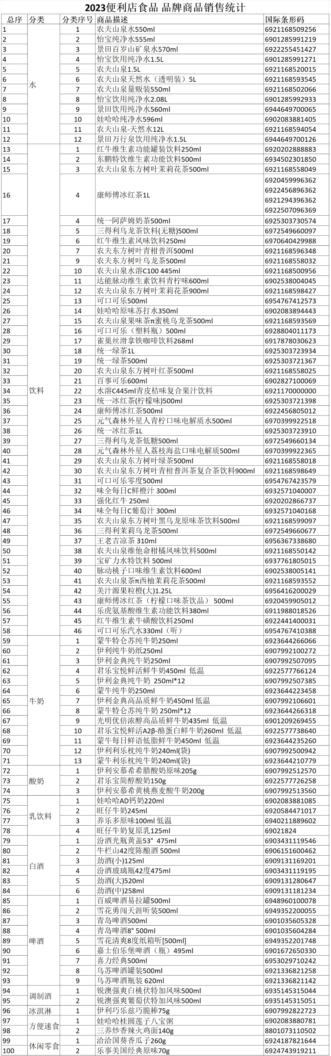 中國便利店暢銷品名單已連續(xù)發(fā)布四年。數(shù)據(jù)來自63家連鎖便利店企業(yè),覆蓋門店7萬余家,其中62家為便利店Top100企業(yè)。 香煙品類銷售占比行業(yè)平均為29.7%,同比2022年下降2.5個(gè)百分點(diǎn)。因其不可控性,未納入銷售和門店滲透統(tǒng)計(jì)。 此統(tǒng)計(jì)基于樣本企業(yè)銷售額前100名商品。在各分類下,按單品匯總銷售額由高到低排列,納入統(tǒng)計(jì)的單品覆蓋6個(gè)(2022年覆蓋5個(gè))及以上樣本企業(yè)。統(tǒng)計(jì)名單中,96個(gè)單品匯總銷售額千萬元以上,比上年減少2個(gè)單品;其中8個(gè)單品銷售額過億。 從四年數(shù)據(jù)看,水類單品數(shù)保持穩(wěn)定,飲料品類單品數(shù)持續(xù)增加,乳飲料單品數(shù)持續(xù)下降。休閑食品、方便食品單品數(shù)也出現(xiàn)下降,這可能是受零食折扣店的影響。調(diào)制酒品類及其兩個(gè)單品首次進(jìn)入名單。 與2022年名單相比,飲料品類商品數(shù)量增加3個(gè);牛奶品類增加4個(gè),新品中低溫奶占主流;乳飲料商品數(shù)減少4個(gè);其他品類單品數(shù)稍有變化。大部分品類延續(xù)新品率下降的趨勢。 水和飲料單品銷售額在名單中表現(xiàn)最好,占據(jù)名單中58個(gè)單品,比2022年增加2個(gè)單品。 水類商品表現(xiàn)最穩(wěn)定,4個(gè)品牌“怡寶、農(nóng)夫山泉、景田、娃哈哈”持續(xù)入圍,12個(gè)單品也均為既有單品,無新增商品。 飲料類商品共20個(gè)品牌46個(gè)單品。新增“樂虎、水溶C100、元?dú)馍帧?個(gè)品牌。“維他、尖叫”未能保留在名單中。新納入名單的15個(gè)新品占本品類的34.8%,新品比例連續(xù)三年下降。 乳飲料類商品共3個(gè)品牌4個(gè)單品,單品數(shù)比2022年少4個(gè)!巴薰、旺仔和養(yǎng)樂多”3個(gè)品牌依然在名單中,“蒙!蔽茨鼙A。無新增商品。 酸奶類商品有2個(gè)品牌3個(gè)單品,單品數(shù)維持不變!耙晾材较!⒕龢穼毢喆肌币廊辉诿麊沃。新品占比33.3%。 牛奶品類有7個(gè)品牌13個(gè)單品,單品數(shù)增加4個(gè)。除“伊利、蒙牛和君樂寶”依然入圍外,新增“光明倍優(yōu)”品牌。新品占比38.5%,高于2022年的11.1%。新單品5個(gè),其中3個(gè)是低溫奶,低溫奶占牛奶品類的38.5%,高于2022年的22.2%的占比。 休閑食品除“恰恰”外,新增“樂事”品牌,共2個(gè)單品,比上年減少1個(gè),新品占比50.0%。 冰淇淋依然是“伊利巧樂茲”1個(gè)單品。此單品連續(xù)四年在名單中。 方便食品有2個(gè)品牌2個(gè)單品,依然是“娃哈哈蓮子粥、三養(yǎng)火雞面”!巴薰徸又唷边B續(xù)四年進(jìn)入名單。此品類無新品引入。 啤酒品類共有6個(gè)品牌9個(gè)單品,比去年減少2個(gè)單品!鞍偻、青島、雪花、烏蘇、喜力”五個(gè)品牌依然在列,2023年新增“嘉士伯樂堡”1個(gè)品牌。新品占比33.3%,新品率進(jìn)一步下降。 白酒類商品有3個(gè)品牌6個(gè)單品。“牛欄山、勁酒、汾酒”依然在名單中,“五糧液”退出。2023年新品占比16.7%,與上一年持平。 今年的名單中,新增了“銳澳”品牌的兩個(gè)調(diào)制酒單品。 |