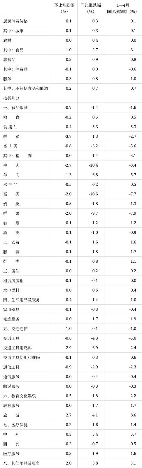 5月11日,國(guó)家統(tǒng)計(jì)局發(fā)布2024年4月份居民消費(fèi)價(jià)格數(shù)據(jù)。 2024年4月份,全國(guó)居民消費(fèi)價(jià)格同比上漲0.3%。其中,城市上漲0.3%,農(nóng)村上漲0.4%;食品價(jià)格下2.7%,非食品價(jià)格上漲0.9%;消費(fèi)品價(jià)格持平,服務(wù)價(jià)格上漲0.8%。1--—4月平均,全國(guó)居民消費(fèi)價(jià)格比上年同期上漲0.1%。 4月份,全國(guó)居民消費(fèi)價(jià)格環(huán)比上漲0.1%。其中,城市上漲0.1%,農(nóng)村持平;食品價(jià)格下降1.0%,非食品價(jià)格上漲0.3%;消費(fèi)品價(jià)格下降0.1%,服務(wù)價(jià)格上漲0.3%。 4月份,食品煙酒類價(jià)格同比下降1.4%,影響CPI(居民消費(fèi)價(jià)格指數(shù))下降約0.39個(gè)百分點(diǎn)。食品中,蛋類價(jià)格下降10.6%,影響CPI下降約0.07個(gè)百分點(diǎn);鮮果價(jià)格下降9.7%,影響CPI下降約0.22個(gè)百分點(diǎn);畜肉類價(jià)格下降3.2%,影響CPI下降約0.10個(gè)百分點(diǎn),其中豬肉價(jià)格上漲1.4%,影響CPI上漲約0.02個(gè)百分點(diǎn);鮮菜價(jià)格上漲1.3%,影響CPI上漲約0.03個(gè)百分點(diǎn);糧食價(jià)格上漲0.5%,影響CPI上漲約0.01個(gè)百分點(diǎn)。 其他七大類價(jià)格同比均上漲。其中,其他用品及服務(wù)、教育文化娛樂價(jià)格分別上漲3.8%和1.8%,衣著、醫(yī)療保健價(jià)格均上漲1.6%,生活用品及服務(wù)、居住、交通通信價(jià)格分別上漲1.4%、0.2%和0.1%。 4月份,食品煙酒類價(jià)格環(huán)比下降0.7%,影響CPI下降約0.19個(gè)百分點(diǎn)。食品中,鮮菜價(jià)格下降3.7%,影響CPI下降約0.08個(gè)百分點(diǎn);鮮果價(jià)格下降2.0%,影響CPI下降約0.04個(gè)百分點(diǎn);蛋類價(jià)格下降2.0%,影響CPI下降約0.01個(gè)百分點(diǎn);畜肉類價(jià)格下降0.8%,影響CPI下降約0.02個(gè)百分點(diǎn);水產(chǎn)品價(jià)格下降0.5%,影響CPI下降約0.01個(gè)百分點(diǎn)。 其他七大類價(jià)格環(huán)比五漲一平一降。其中,其他用品及服務(wù)、交通通信價(jià)格分別上漲2.0%和1.0%,教育文化娛樂、生活用品及服務(wù)、醫(yī)療保健價(jià)格分別上漲0.5%、0.4%和0.2%;居住價(jià)格持平;衣著價(jià)格下降0.1%。 |