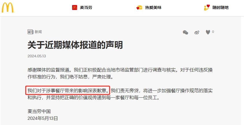 5月13日晚,麥當勞中國發(fā)布《關于近期媒體報道的聲明》稱,感謝媒體的監(jiān)督報道。正積極配合當地市場監(jiān)管部門進行調查與核實。對于任何違反操作標準的行為,絕不姑息,嚴肅處理。 麥當勞表示,對于涉事餐廳帶來的影響深表歉意。將進一步加強餐廳操作規(guī)范的落實和執(zhí)行,并堅持把正確的價值觀傳遞到每一家餐廳和每一位員工。 據新京報報道,近期,記者先后臥底麥當勞鄭州卓越農聯(lián)餐廳和麥當勞濟南大學餐廳,發(fā)現(xiàn)兩家餐廳均存在篡改食品保質期標簽、使用過期食材、食物過了保存期依舊售賣以及偷工減料等問題。麥當勞鄭州卓越農聯(lián)餐廳還存在炸油品質超標的情況。 |