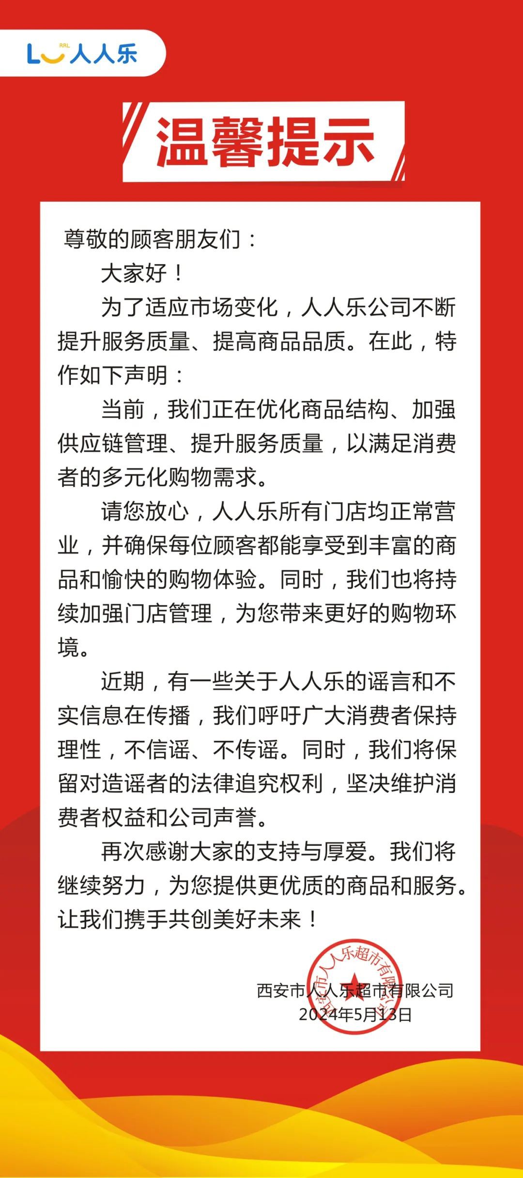 當前,正在優(yōu)化商品結構、加強供應鏈管理、提升服務質量,以滿足消費者的多元化購物需求。 人人樂稱所有門店均正常營業(yè),并確保每位顧客都能享受到豐富的陪品和愉快的購物體驗。同時,也將持續(xù)加強門店管理,為顧客帶來更好的購物環(huán)境。 聲明中還稱:近期,有一些關于人人樂的謠言和不實信息在傳播,我們呼吁廣大消費者保持理性,不信謠、不傳謠。 同時,我們將保留對造謠者的法律追究權利,堅決維護消費者權益和公司聲譽。再次感謝大家的支持與厚愛。我們將繼續(xù)努力,為您提供更優(yōu)質的商品和服務讓我們攜手共創(chuàng)美好未來! 此前,有網友發(fā)帖稱,人人樂多家商超裝修改造,也有網友質疑人人樂是否面臨倒閉關店。 |