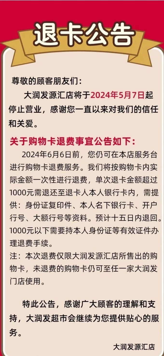 近日,大潤發(fā)漯河源匯店發(fā)出公告稱,該店5月7日起停止?fàn)I業(yè)。 關(guān)于購物卡退費(fèi)事宜,大潤發(fā)發(fā)布公告稱:2024年6月6日前,仍可在本店服務(wù)臺進(jìn)行購物卡退費(fèi)服務(wù),將按購物卡內(nèi)實際金額一次性進(jìn)行退費(fèi)。 據(jù)了解,大潤發(fā)漯河源匯店位于漯河市區(qū)人民路中段,于2018年正式開業(yè),至今僅有6年。 對于閉店原因,目前尚未說明。 |